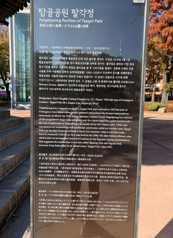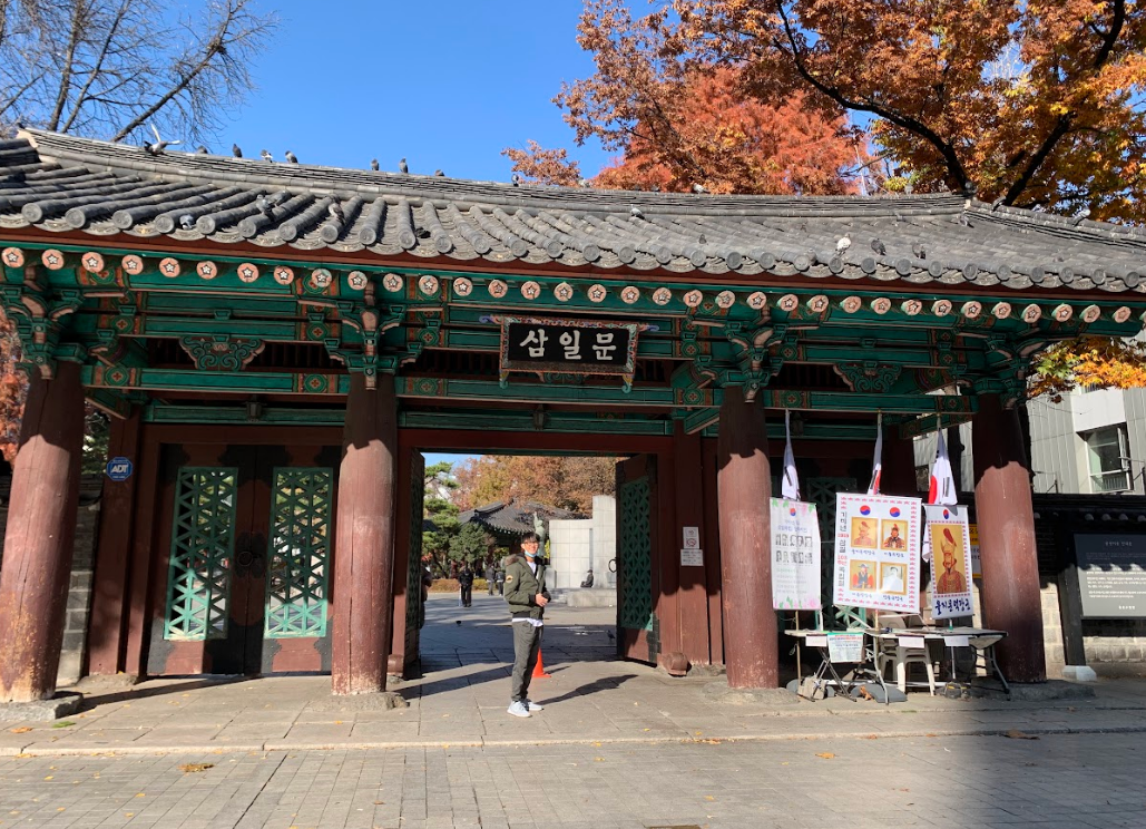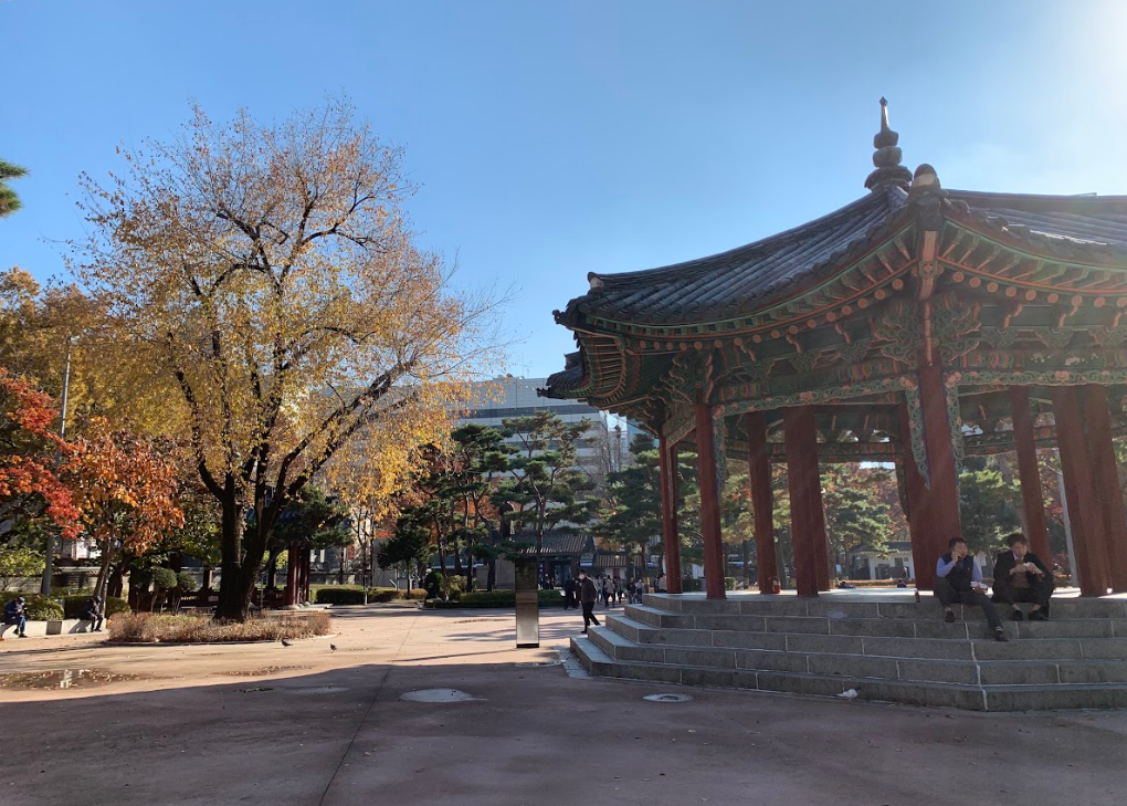 Turns out this is called Palgakjeong Pavilion in this park called Tapgol Park. This serene spot is not just a picturesque gathering place; it's where the call for Korean independence was boldly declared on March 1, 1919, during the turbulent Japanese Colonial Period. Established in the 1890s, Tapgol Park holds the distinction of being Seoul's first modern park, blending rich history with beautiful landscapes. Whether you're a history buff or a casual visitor, this site is a must-see when exploring the cultural heart of the city.