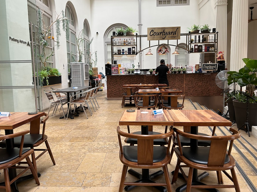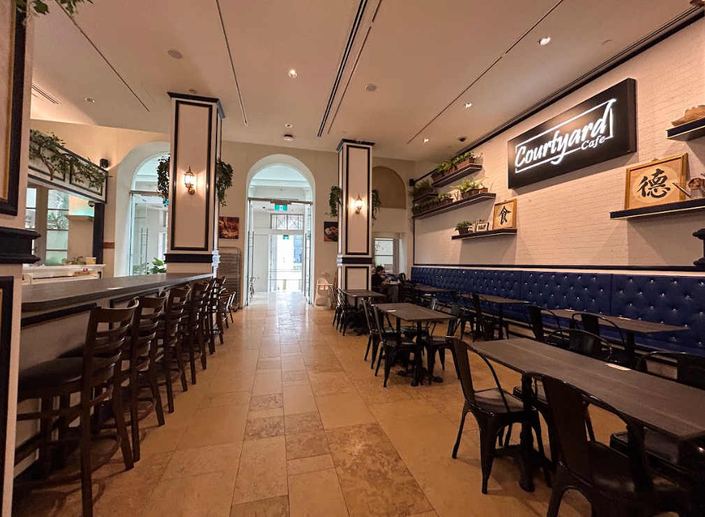 We walked back out into the foyer towards the exit of the building, passing by more cafes on our way.