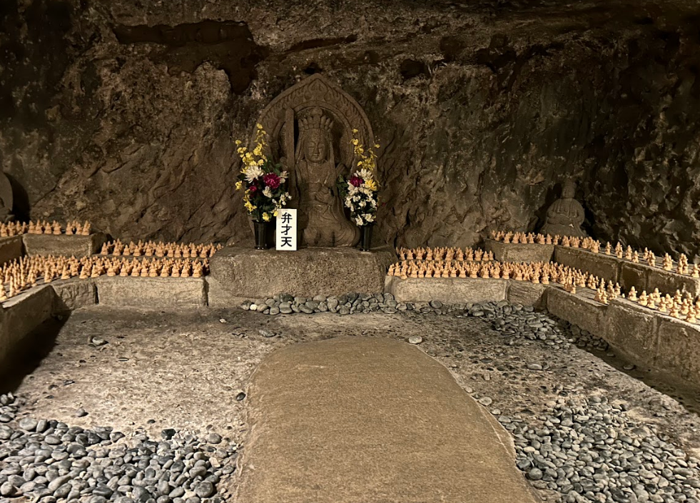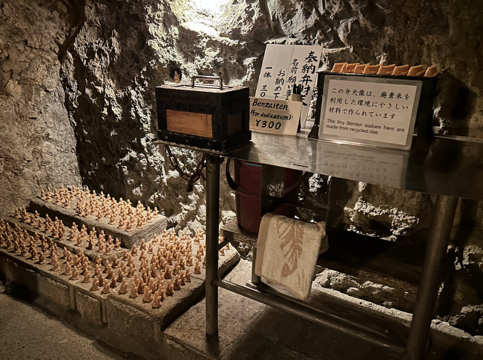 Of all the stone statues this particular one was lit up and the only one with some flowers and a donation box in front of it. I guess this statue was also supposed to be of Benten and maybe this cave is dedicated to her. The instrument looked familiar though.