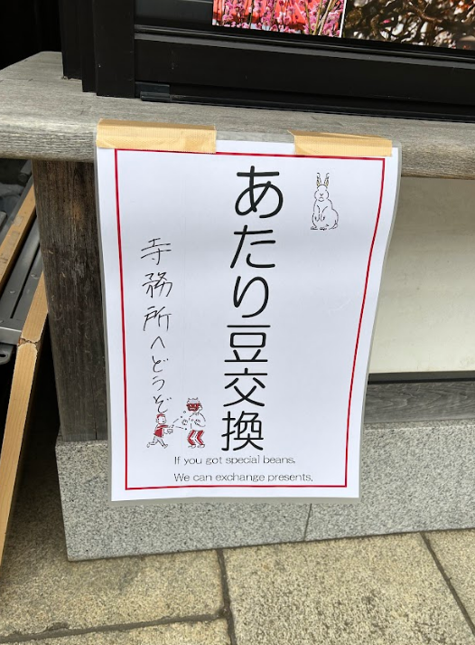 One of the buildings had this notice taped to it, which I found quite curious. I have heard of the Japanese stories about people using beans or millet to throw at onis or Japanese demons to ward them away, which I guess this sign is alluding to?