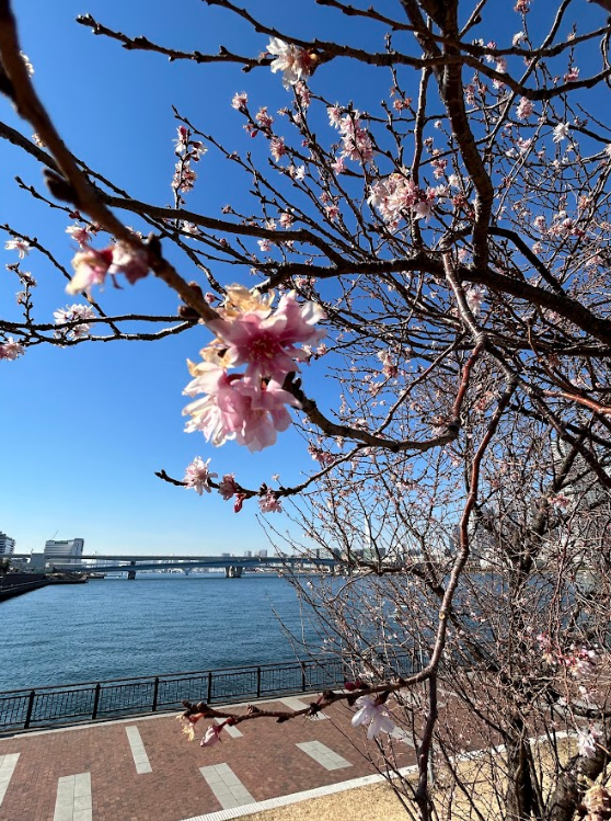 After that we took a walk to the nearby park which also looks out into the river! It was very sunny but the sky was a beautiful cloudless blue and we even managed to find a few cherry blossom flowers!