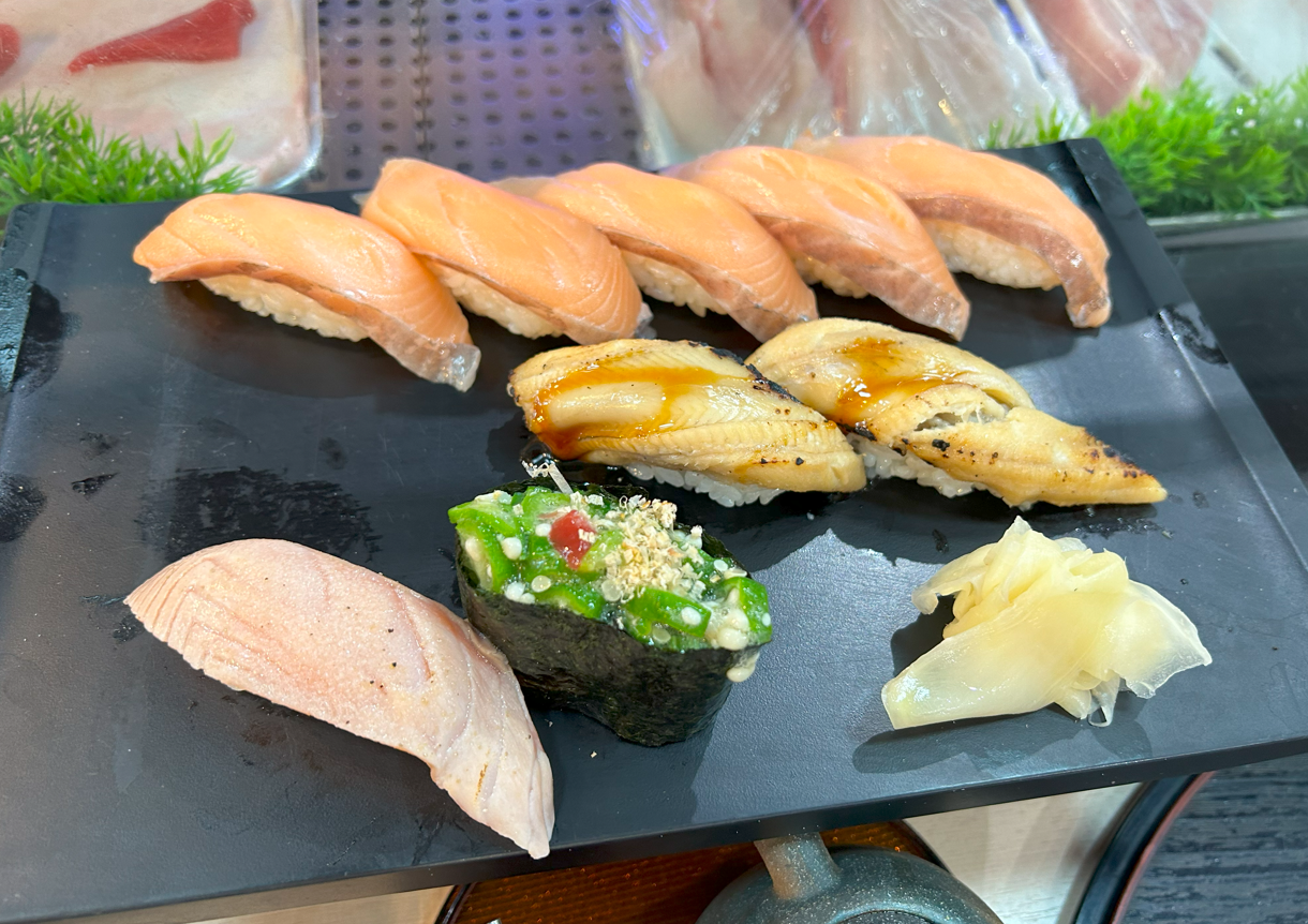 This was our first plate, with our favourites the salmon nigiri, anago eel (freshwater eel), and some new ones like the broiled salmon and okura sushi.