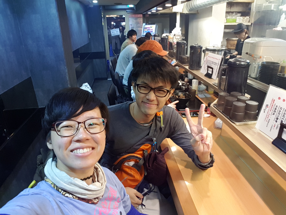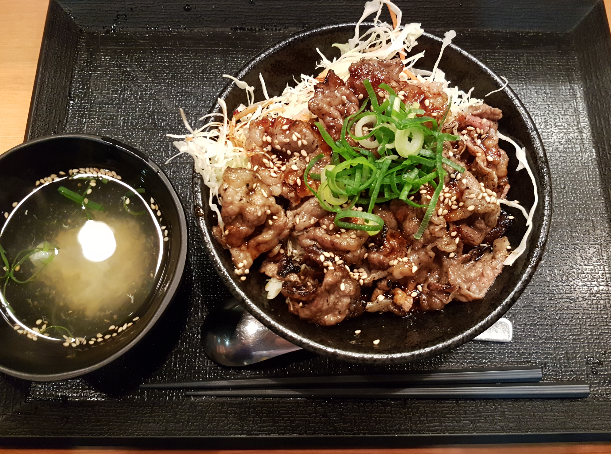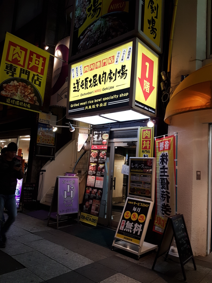 After taking a nice scenic stroll enjoying the sunset at Dotonbori, we were getting quite hungry. We saw quite a queue for this grilled meat rice bowl shop and the smell was so overpowering we decided to queue up for it.