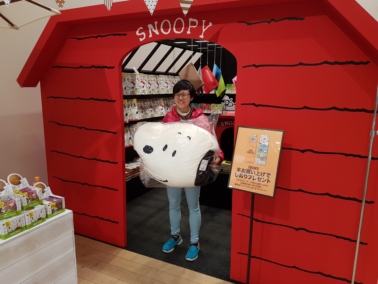 A human-size Snoopy doghouse with Japanese Snoopy books, and a huuuge Snoopy pillow!