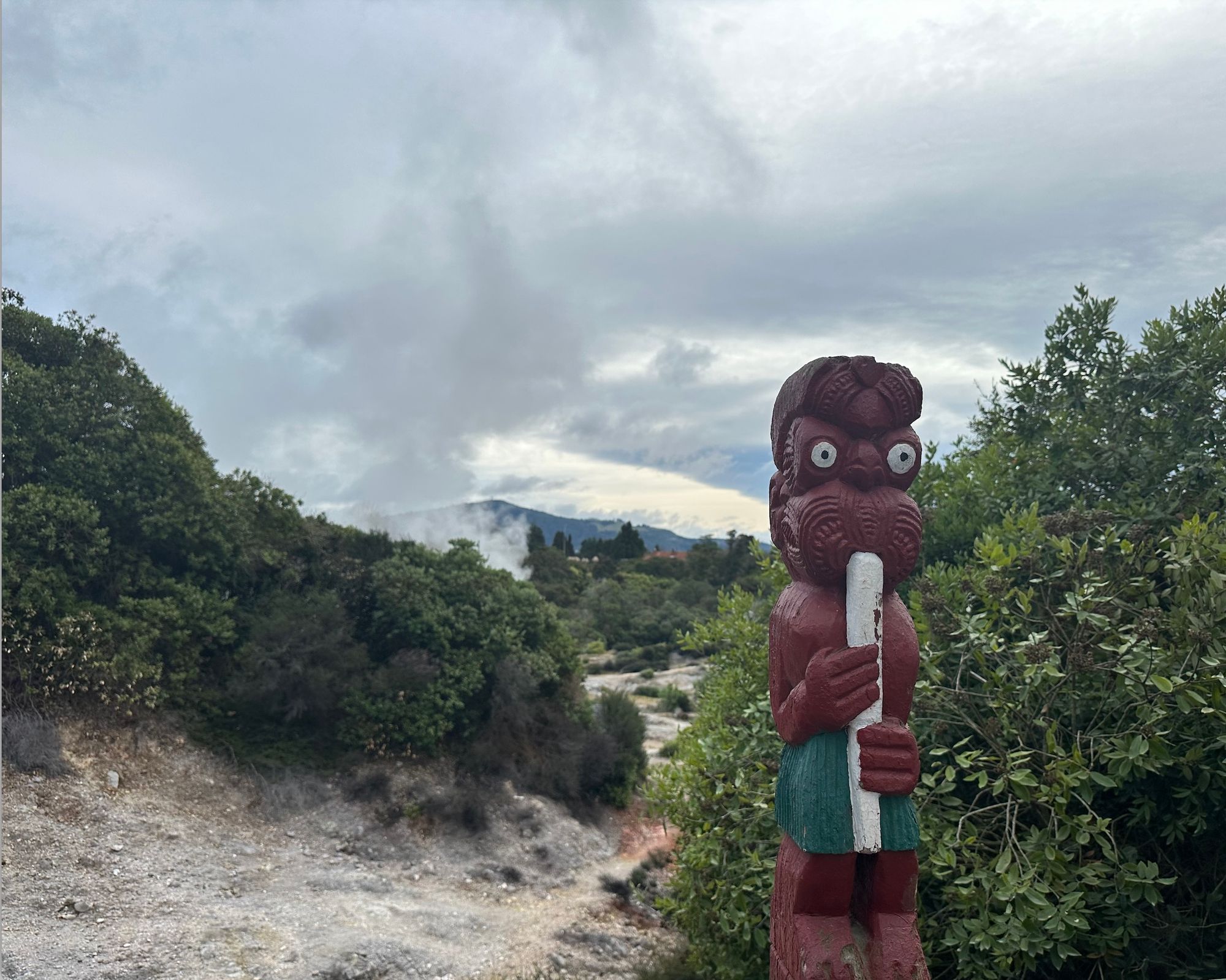 Both Maori villages we saw had an Anglican and a Catholic church. Interspersed with that iconography, you see these statues which represent ancestors, instead of a gravestone. For obvious reasons, they can’t dig down and bury their dead.