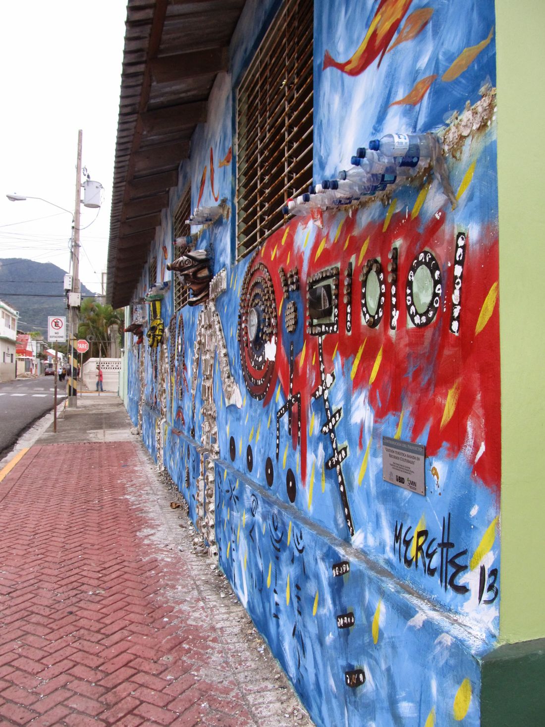Jesteśmy w miejscu, które Krzysztof Kolumb nazwał Puerto Plata, czyli Srebrnym Portem, przybywając tu 11 stycznia 1493 roku. Skąd wzięła się nazwa ? Niektórzy uważają, że od znajdujących się w tym miejscu pokładów srebra, inni, że po prostu od srebrnego koloru fal oceanu, w którym odbijało się słońce. Dziś Puerto Plata to duże, jak na Dominikanę miasto, zajmujące powierzchnie 459,71 km², na której mieszka 277 981 ludzi (gęstość zaludnienia: 319,5 os./km²). Podobno największe miasto i port w północnej Dominikanie. Samo w sobie nie jest jednak specjalnie ciekawe, chyba, że ktoś interesuje się architekturą i zabudową wiktoriańską, wtedy pewnie znajdzie tu coś dla siebie. Nas zaciekawiła fasada jednego z budynków na którym wyłożona była mozaika ze....śmieci. Plastikowych butelek, puszek, korków itp. ułożonych jednak w tak oryginalny i ciekawy sposób, że zasługiwała na uwiecznienie na poniższej fotografii.
