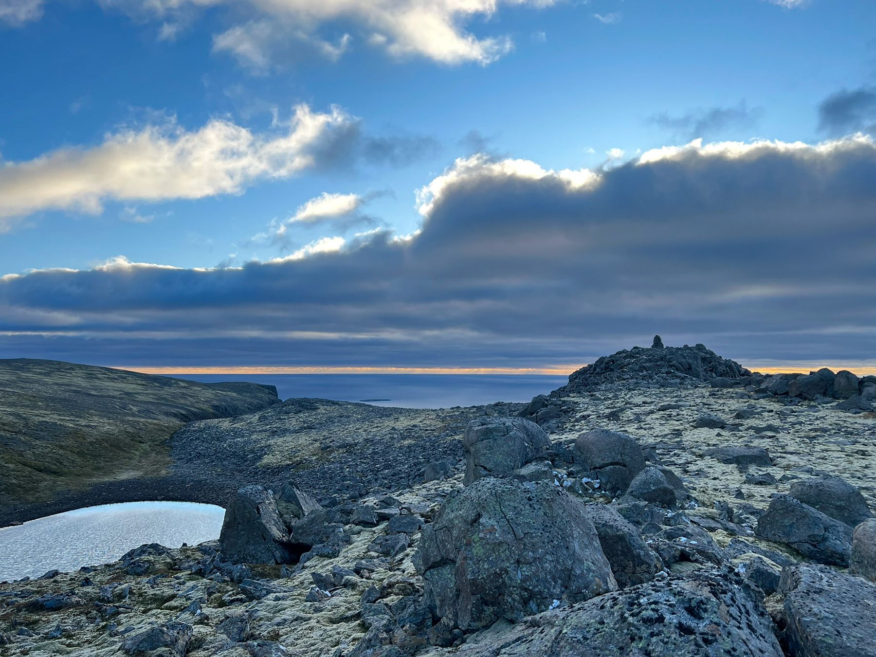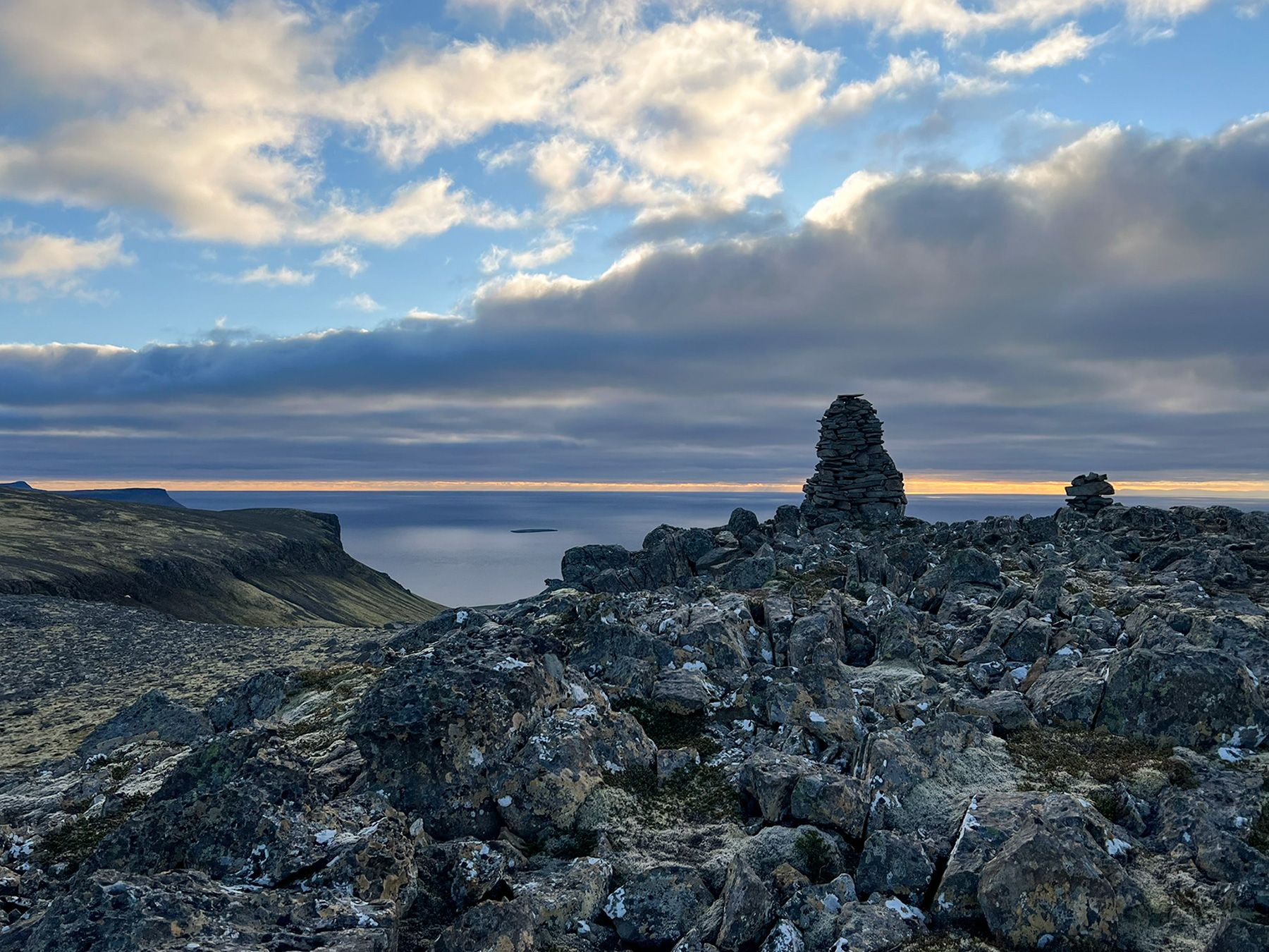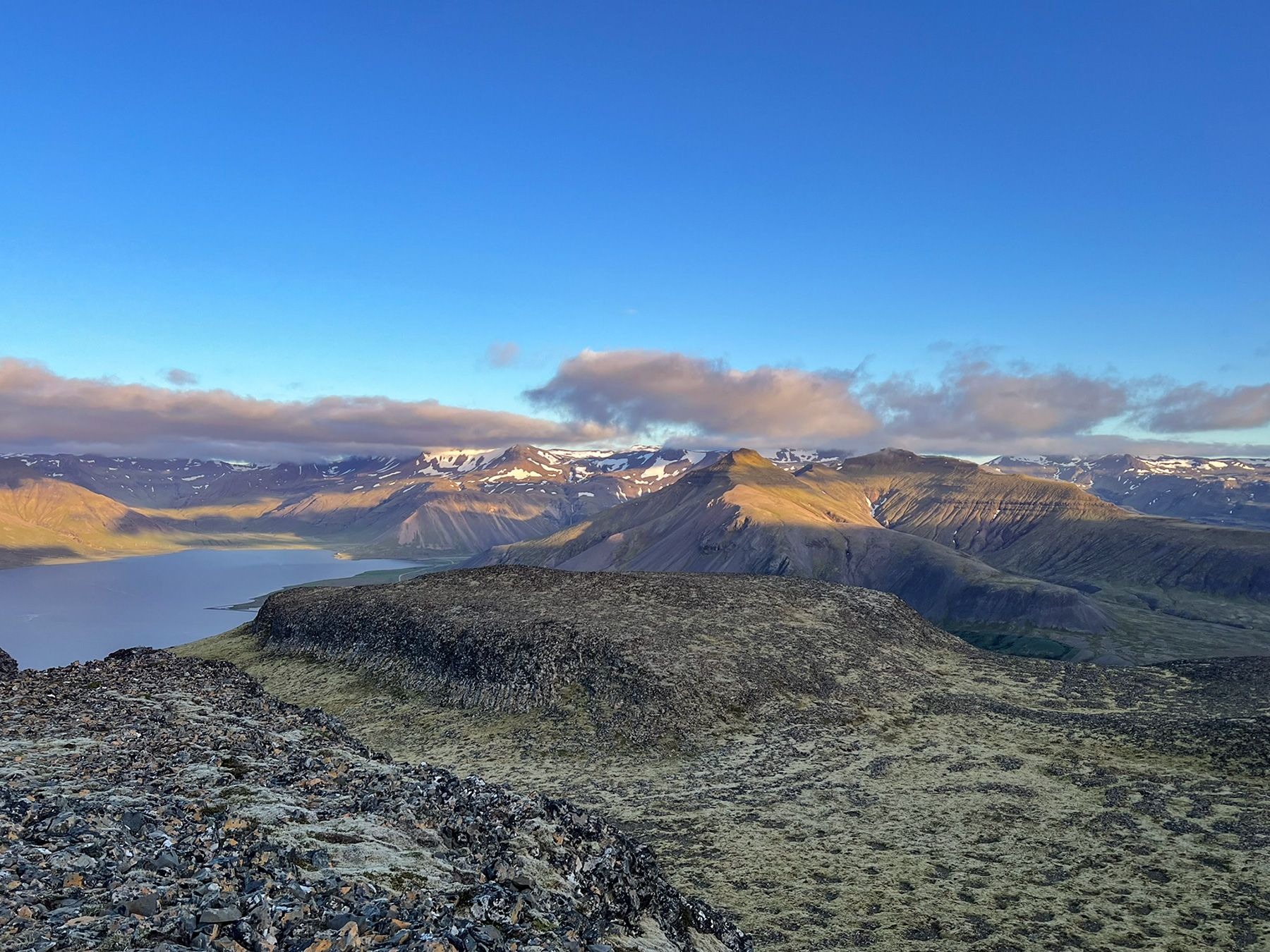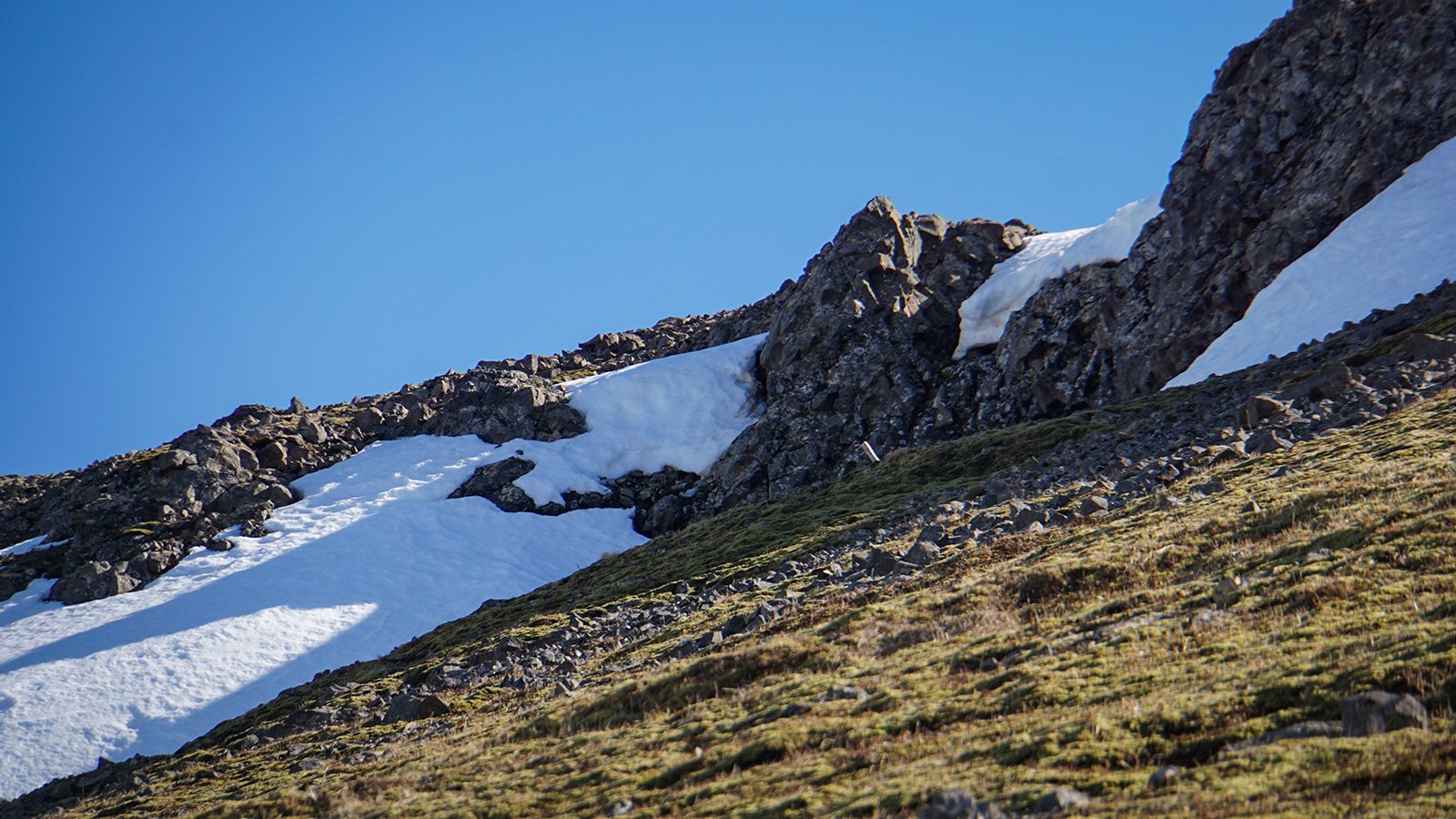 Zima wciąż jedną stópką stała na półwyspie, dlatego na spacer wybrałam się ledwie na sąsiedni cypelek - kamienisty i obiektywnie patrząc mało ciekawy. Jednak lubię go bardzo. Jest na nim kilka niewysokich wzgórz i można się pomiędzy nimi powłóczyć bez wysiłku, taki też był plan. Wyszło jak zwykle, czyli inaczej. Jedna ze ścieżek poprowadziła mnie pod górę Klakkur, rozłożysty, płaski masyw o szalonej wysokości 380 metrów. Ani się obejrzałam, a stałam już pod jego skalistym zwieńczeniem. Tam zatrzymał mnie śnieg i stromizna. Kamienne kopczyki wzywały z krawędzi, lecz po namyśle odpuściłam podejście. Nie wiedziałam na ile stabilna jest warstwa śniegu, nie miałam raków i byłam sama.