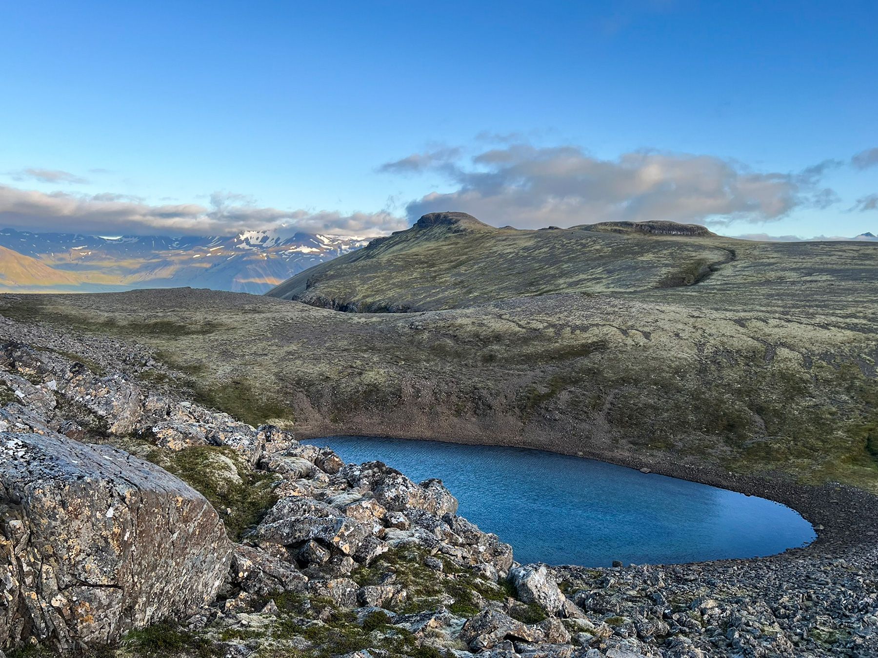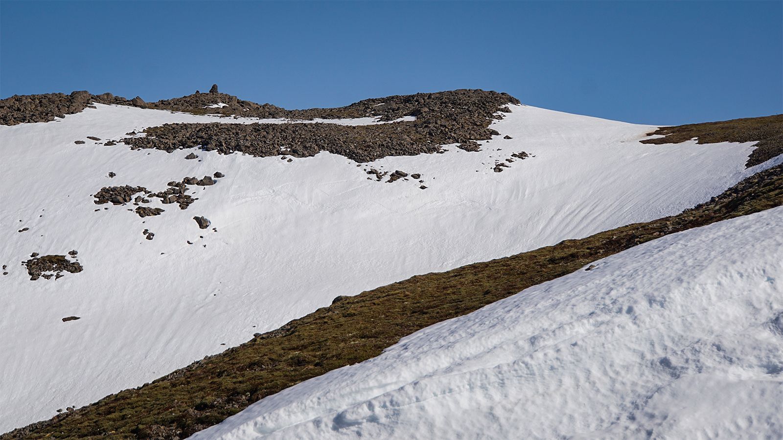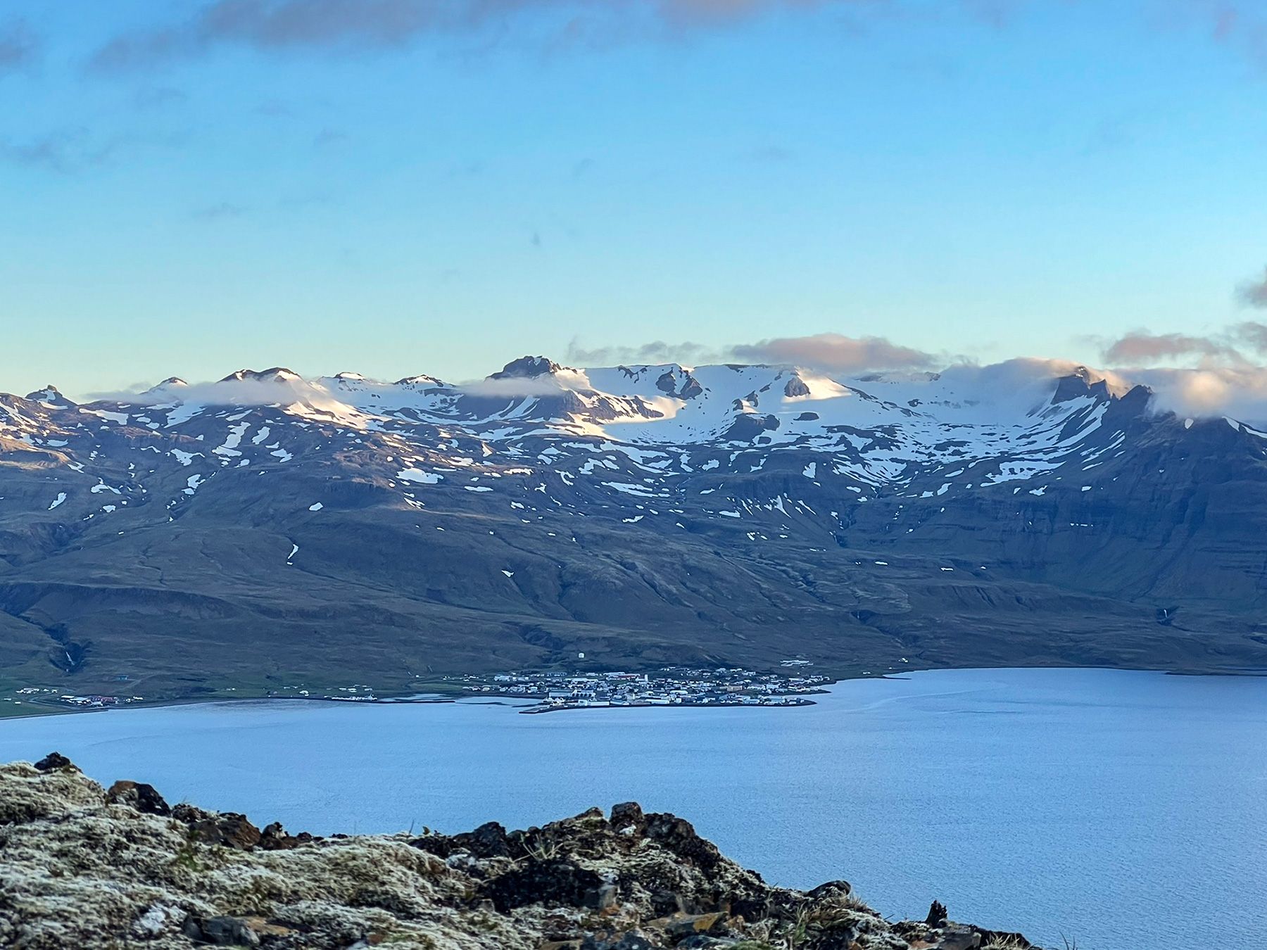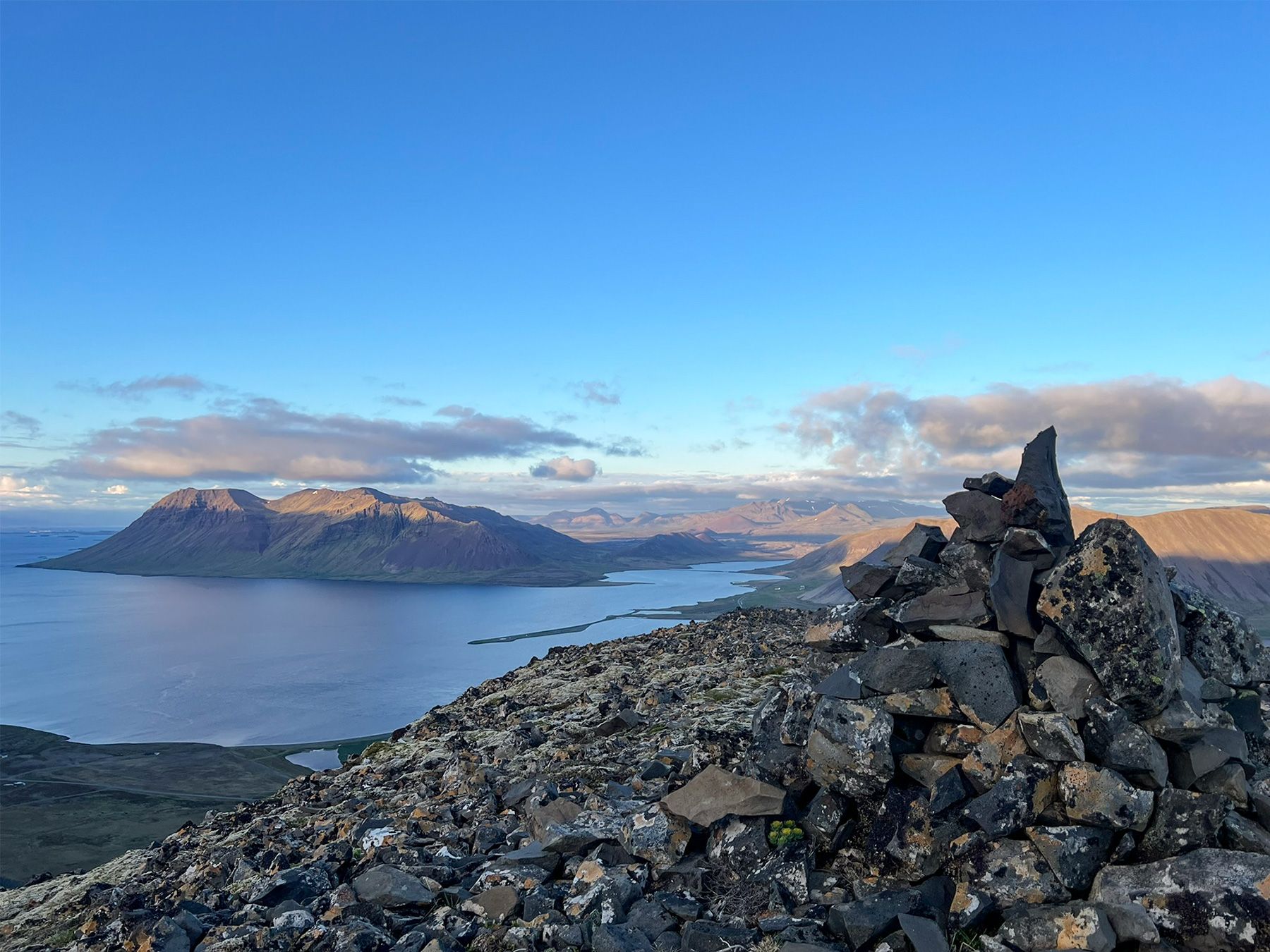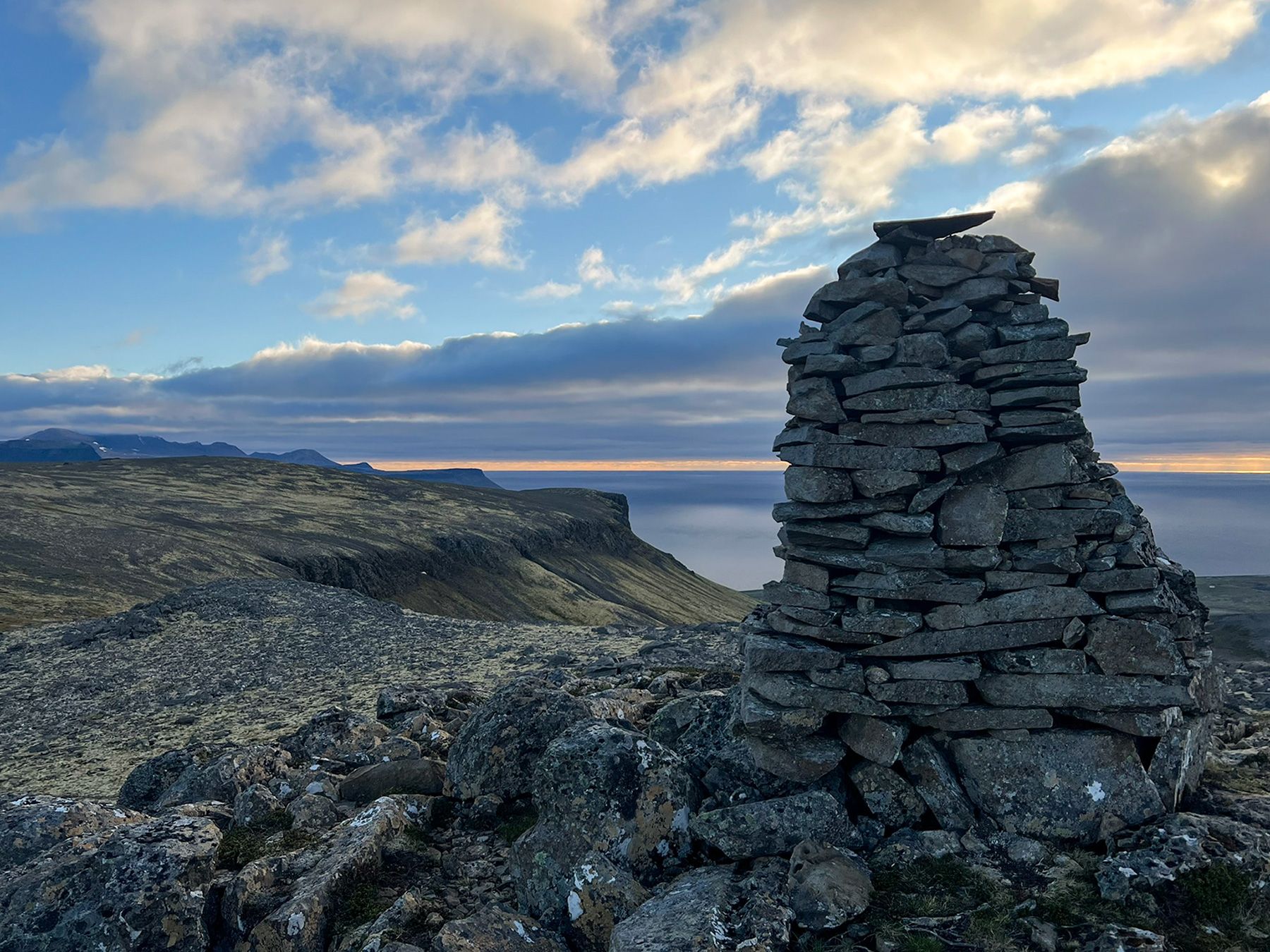 Zima wciąż jedną stópką stała na półwyspie, dlatego na spacer wybrałam się ledwie na sąsiedni cypelek - kamienisty i obiektywnie patrząc mało ciekawy. Jednak lubię go bardzo. Jest na nim kilka niewysokich wzgórz i można się pomiędzy nimi powłóczyć bez wysiłku, taki też był plan. Wyszło jak zwykle, czyli inaczej. Jedna ze ścieżek poprowadziła mnie pod górę Klakkur, rozłożysty, płaski masyw o szalonej wysokości 380 metrów. Ani się obejrzałam, a stałam już pod jego skalistym zwieńczeniem. Tam zatrzymał mnie śnieg i stromizna. Kamienne kopczyki wzywały z krawędzi, lecz po namyśle odpuściłam podejście. Nie wiedziałam na ile stabilna jest warstwa śniegu, nie miałam raków i byłam sama.