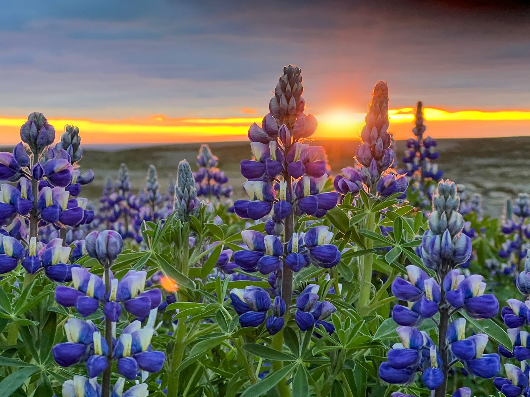 Słońce zachodziło tego dnia tuż po jedenastej, akurat gdy schodziłam. Przebiło się dosłownie na chwilkę pomiędzy chmurami, więc przystanęłam na małą sesję w łubinach. Są śliczne i ładnie pachną, ale to gatunek inwazyjny. Nawet ogromna populacja owiec nie jest w stanie ich przeżreć.