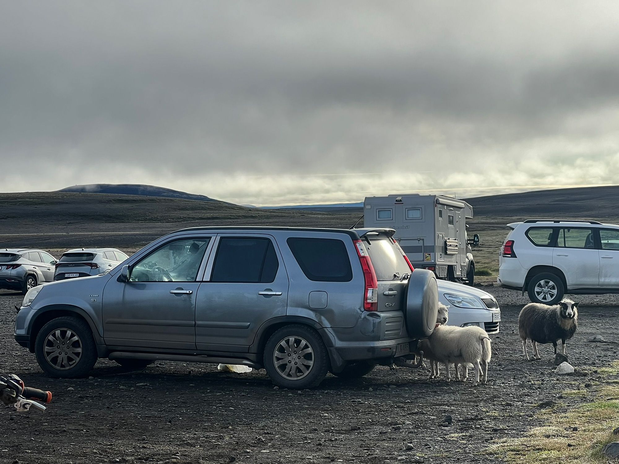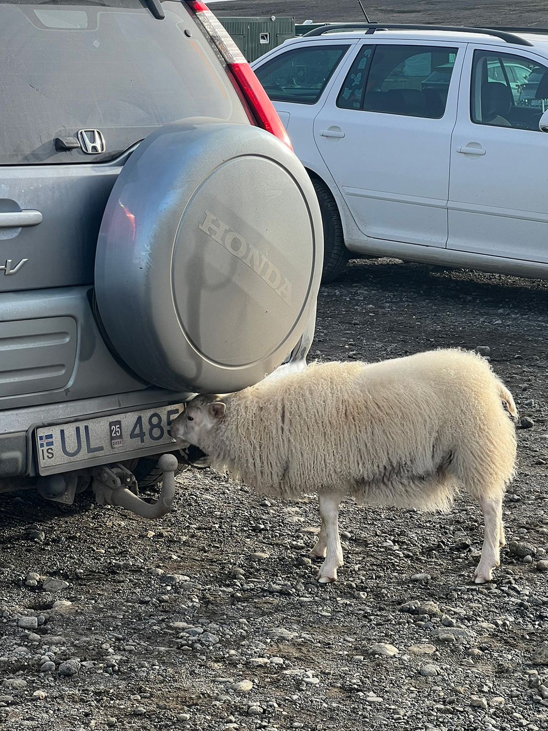 Na porannym spacerze przyłapałam przy Hondzi mały gang. Gagatki zlizywały pył z samochodu, może zawierał sól albo inny smaczny minerał. Na marginesie - przeczytałam ostatnio, że po raz pierwszy w historii liczba ludzi mieszkających na Islandii przekroczyła liczbę owiec.