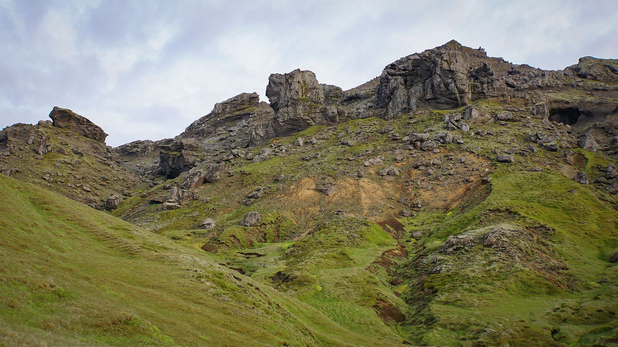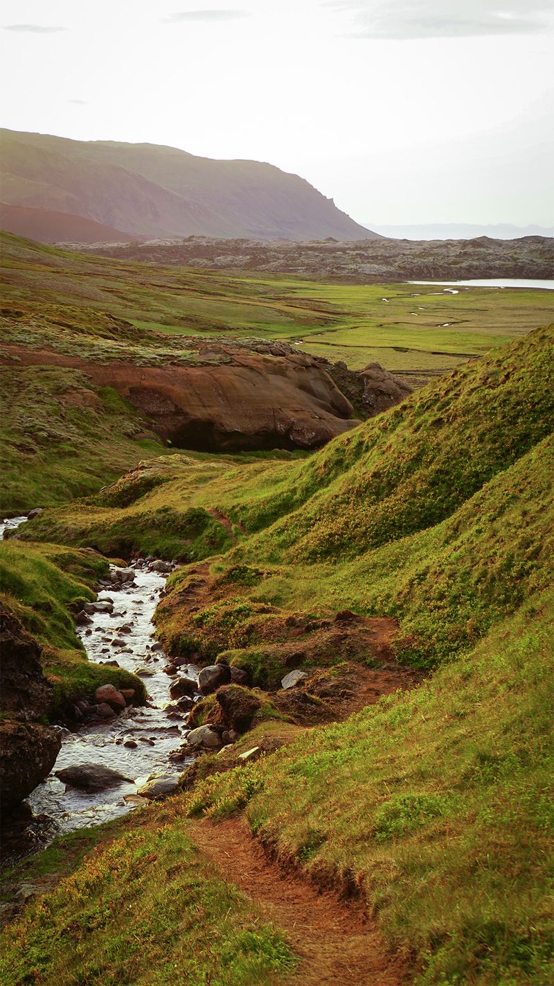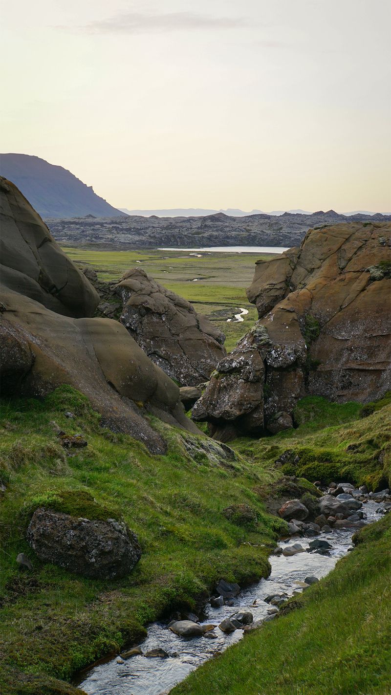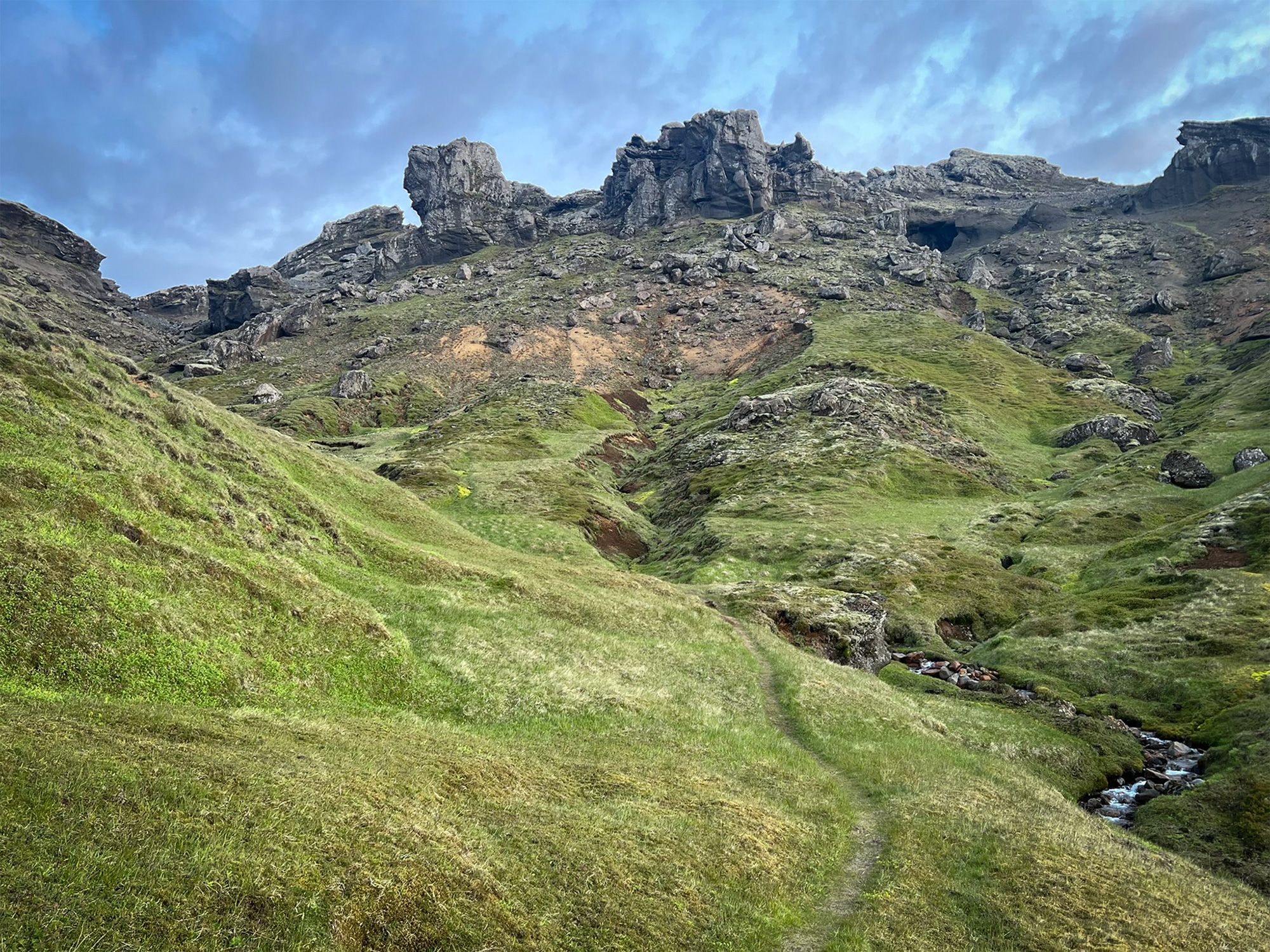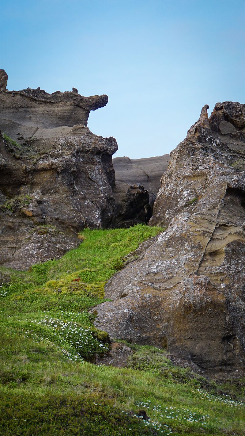 Idąc wzdłuż potoku spływającego spod szczytu przekroczyłam coś, co wyglądało jak skalna brama. Obok nurtu biegła wąska ścieżka. Uznałam, że - jak to często tutaj bywa - wydeptały ją owce. Wiedziałam jednak, że zaglądają tu również nieliczni, dwunożni wędrowcy - głównie Islandczycy.