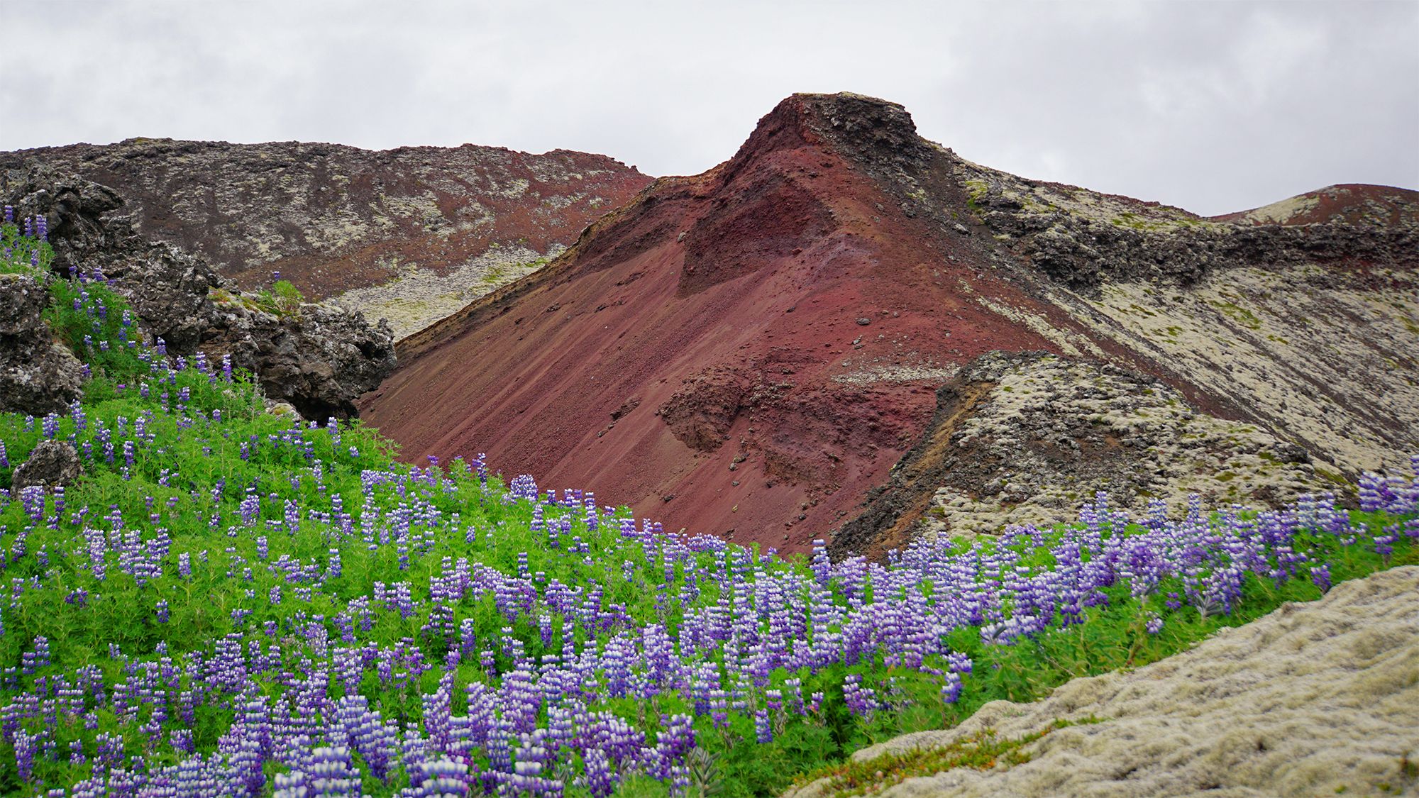 Tym sposobem, na deser, został nam tylko jeden krater. Niepozorny, rozkopany, przeplatany łubinem. Pojechałam go zobaczyć tydzień później i to była zupełnie inna bajka. Czy to kwestia cudownej, dramatycznej pogody, czy mojego nastroju - nieistotne. Ten zakątek mnie tak zauroczył, że wróciłam dnia następnego. Jest zupełnie inny niż pozostałe - ukryty w polu lawy, stapiający się z nim. Otoczony chaotycznym labiryntem miękko wyściełanych skał. Było tam coś... sama nie wiem co. Dusza Berserkjahraun? Jeśli elfy istnieją, to mieszkają tutaj.