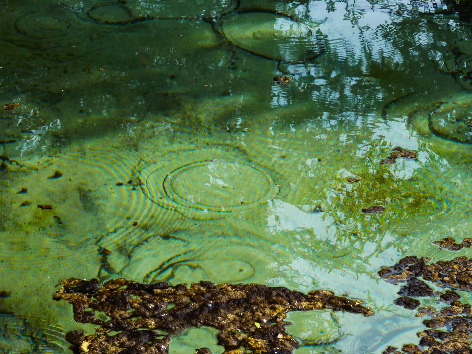 jest tzw. pulsującym źródłem. Z tym tajemniczym określeniem spotkałam się po raz pierwszy. Woda przeciska się szczelinami w dnie pod ciśnieniem, wzburzając wapienny miał, który unosi się i kotłuje. W tych miejscach tworzą się jakby małe, nieustannie pulsujące gejzery - stąd nazwa. Wypływająca woda jest w stanie poruszyć "piasek", lecz nie na tyle mocno, by zmącić krystaliczną przejrzystość zbiornika. Kolor wody i hipnotyczny ruch piasku na dnie sprawia, że nie można oderwać od niego oczu.