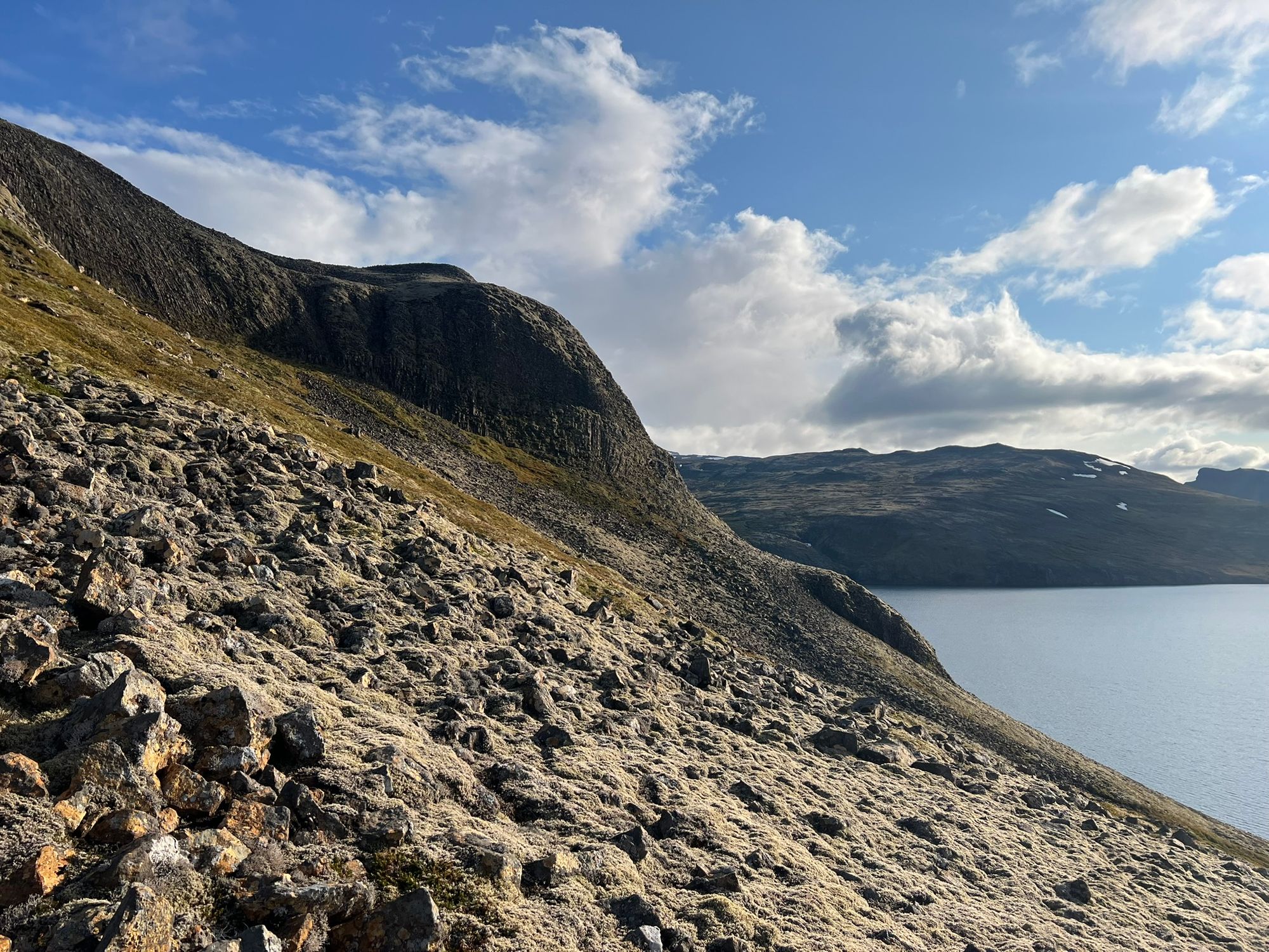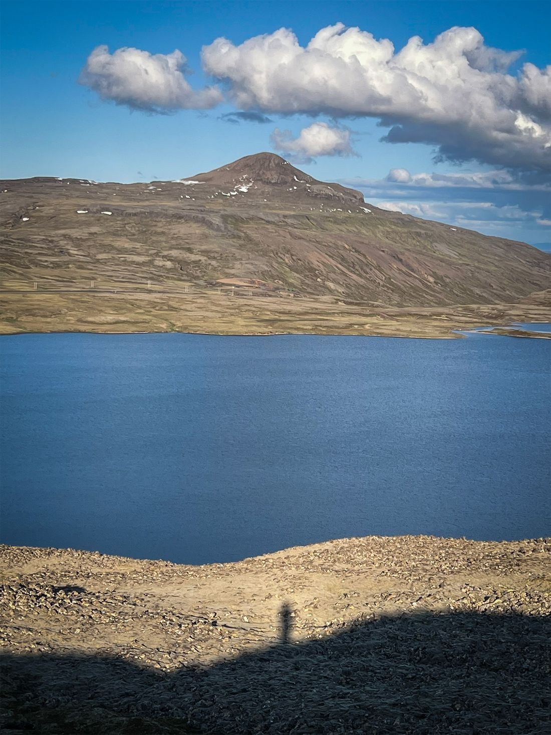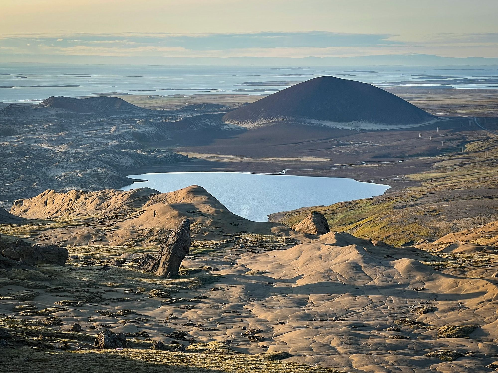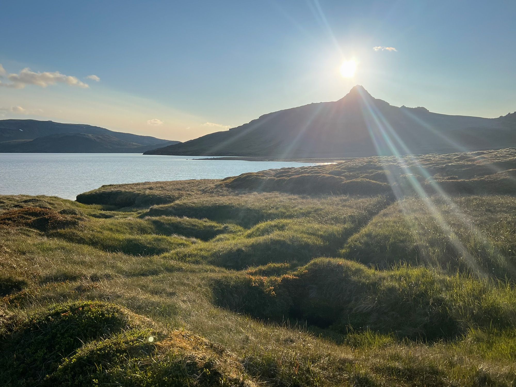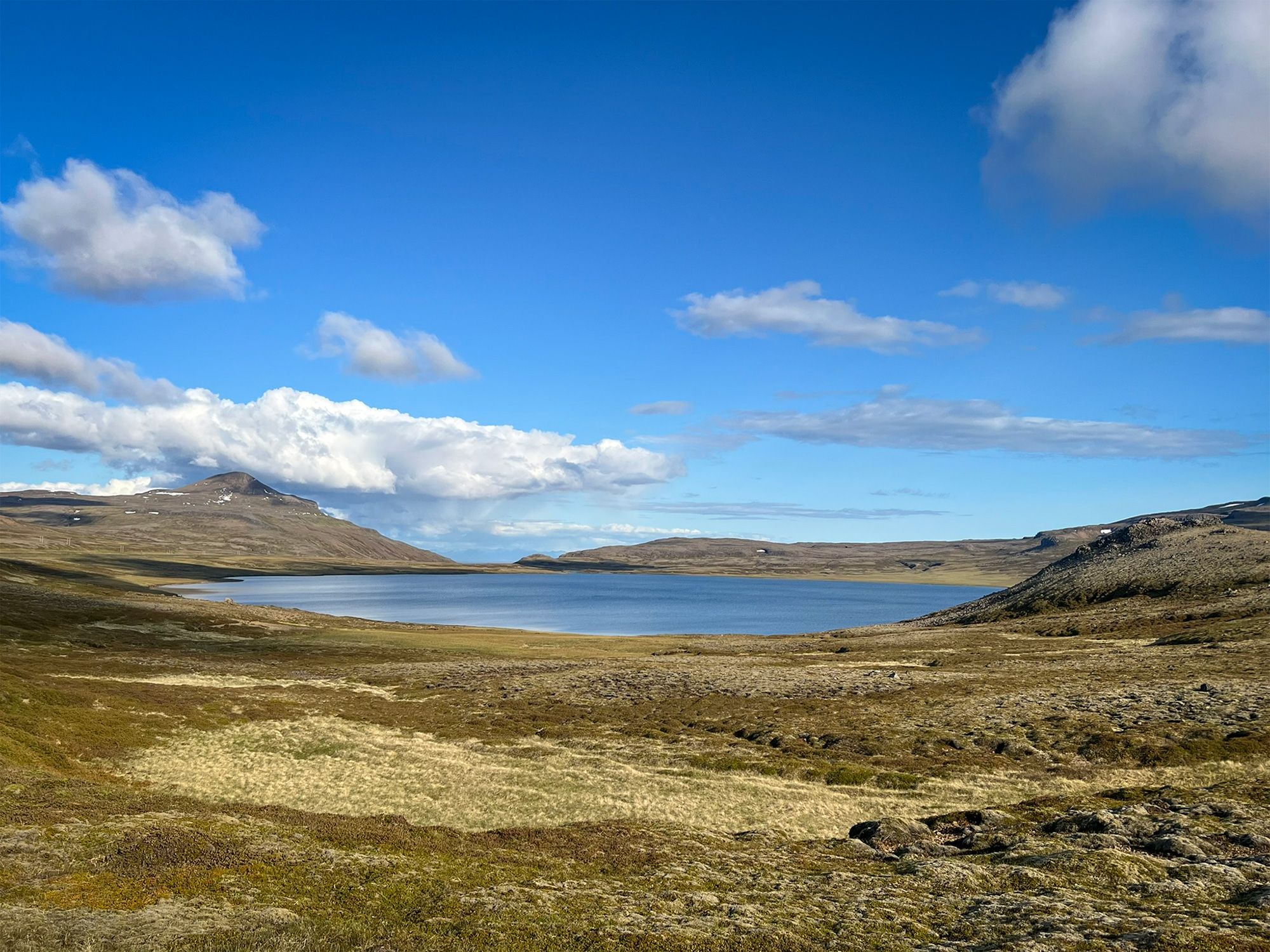 Pogoda była jak marzenie, okolica bezludna. Na przystawkę weszłam na przycupniętą między jeziorami, niepozorną Vatnafell. Jest mniejsza od Horna tylko o 60 metrów, ale jakże odmienna. Taki duży ziemniak. Piszę to z sympatią, bo nasze krótkie spotkanie było przyjemne. Płaska powierzchnia góry, prócz sterty kamieni, oferuje komfortowe materace z mchu.