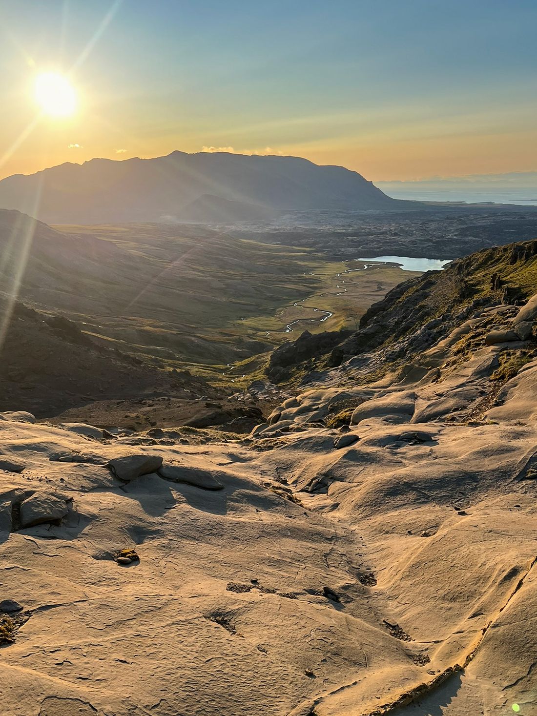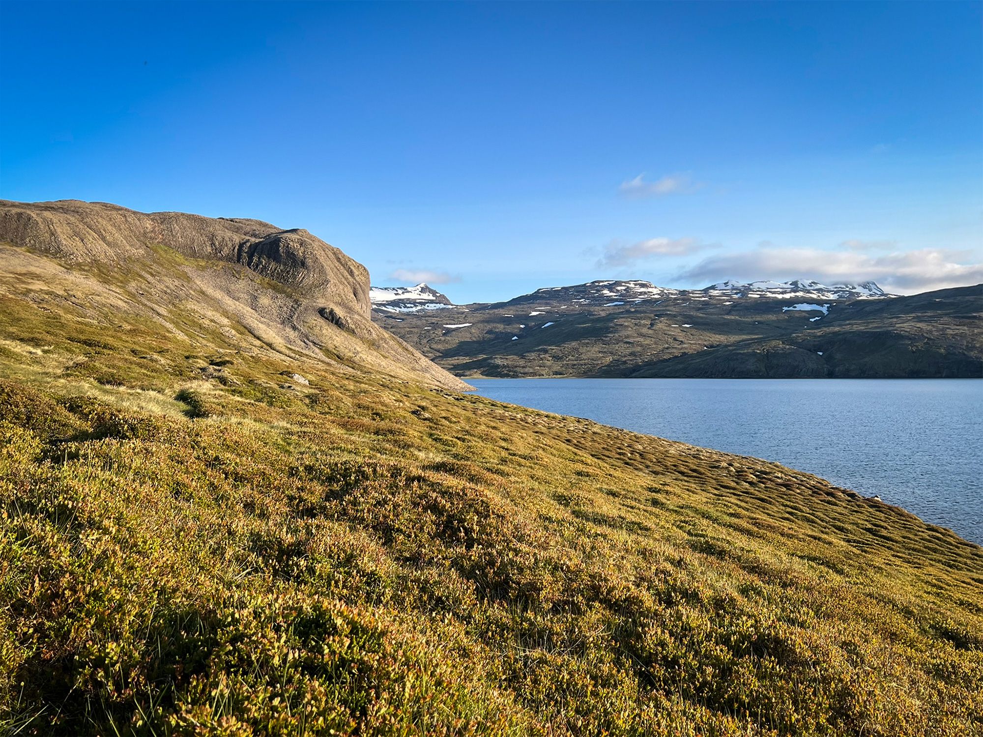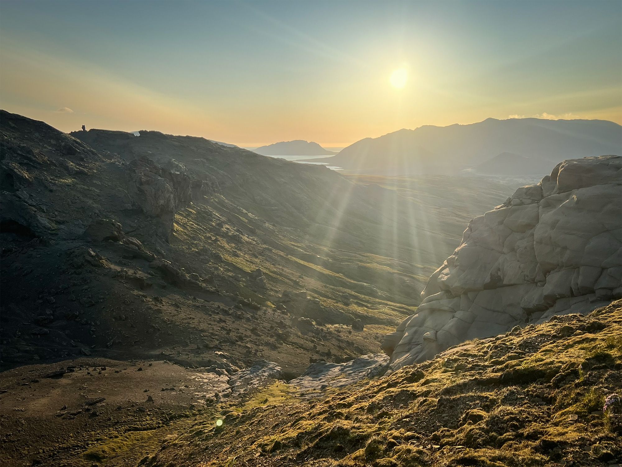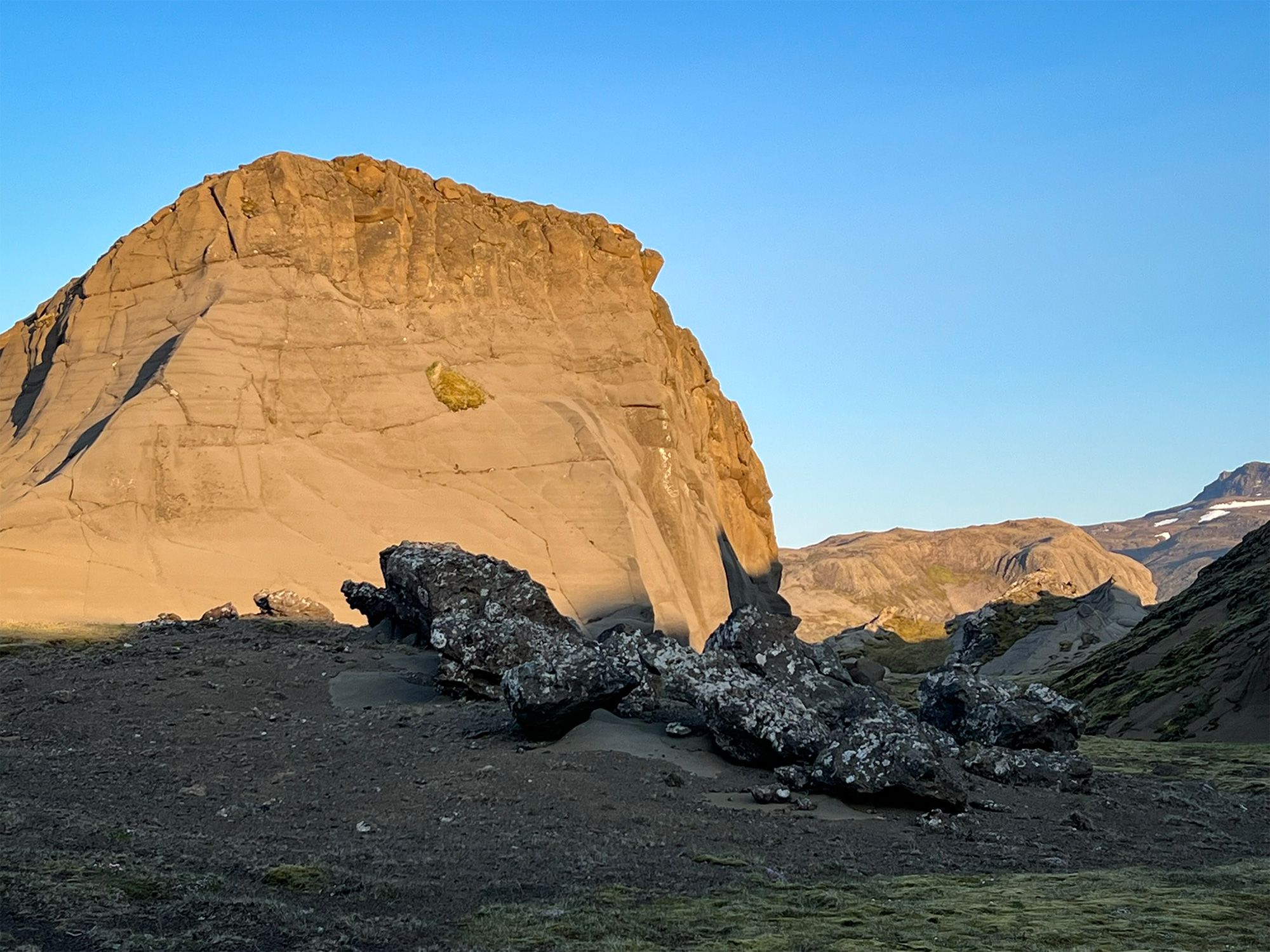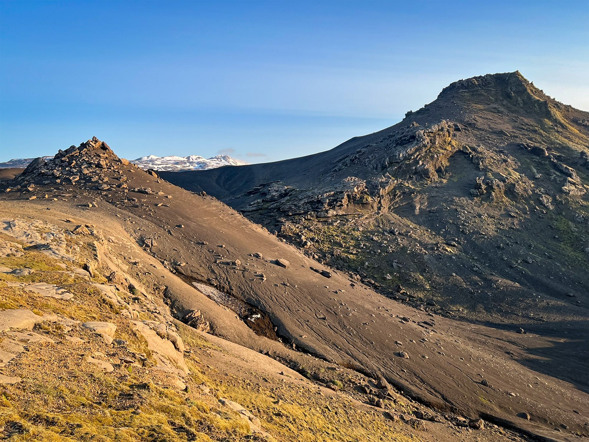 Pogoda była jak marzenie, okolica bezludna. Na przystawkę weszłam na przycupniętą między jeziorami, niepozorną Vatnafell. Jest mniejsza od Horna tylko o 60 metrów, ale jakże odmienna. Taki duży ziemniak. Piszę to z sympatią, bo nasze krótkie spotkanie było przyjemne. Płaska powierzchnia góry, prócz sterty kamieni, oferuje komfortowe materace z mchu.