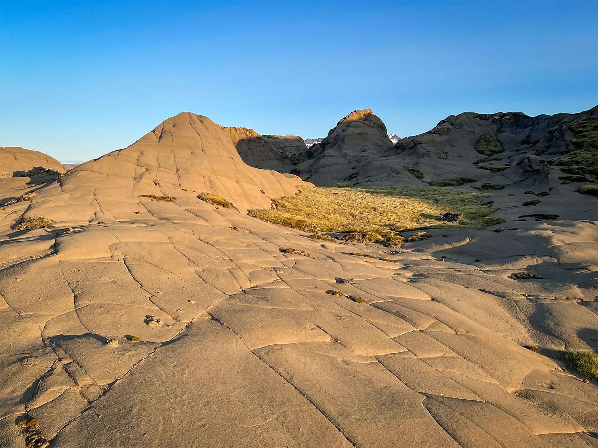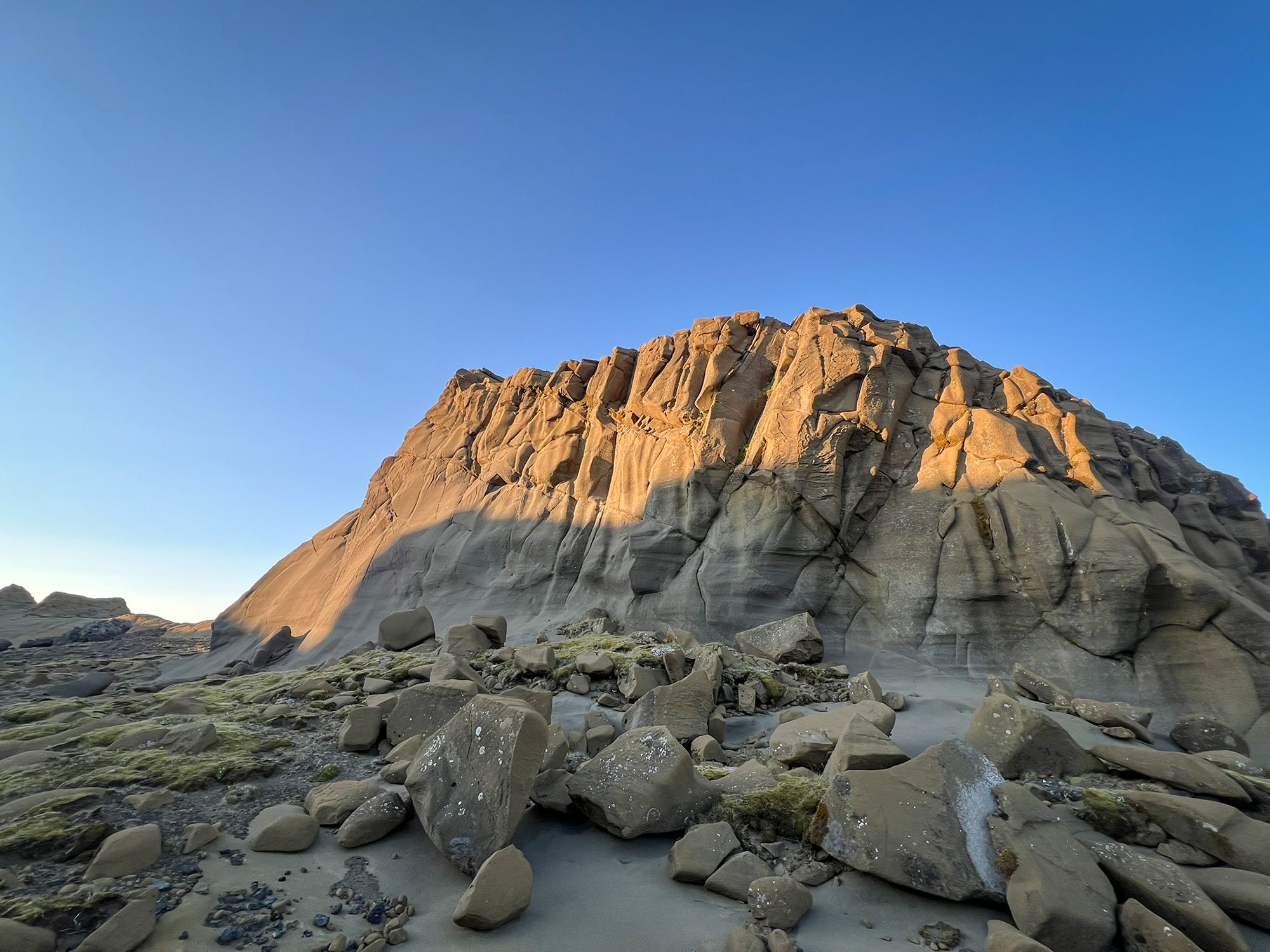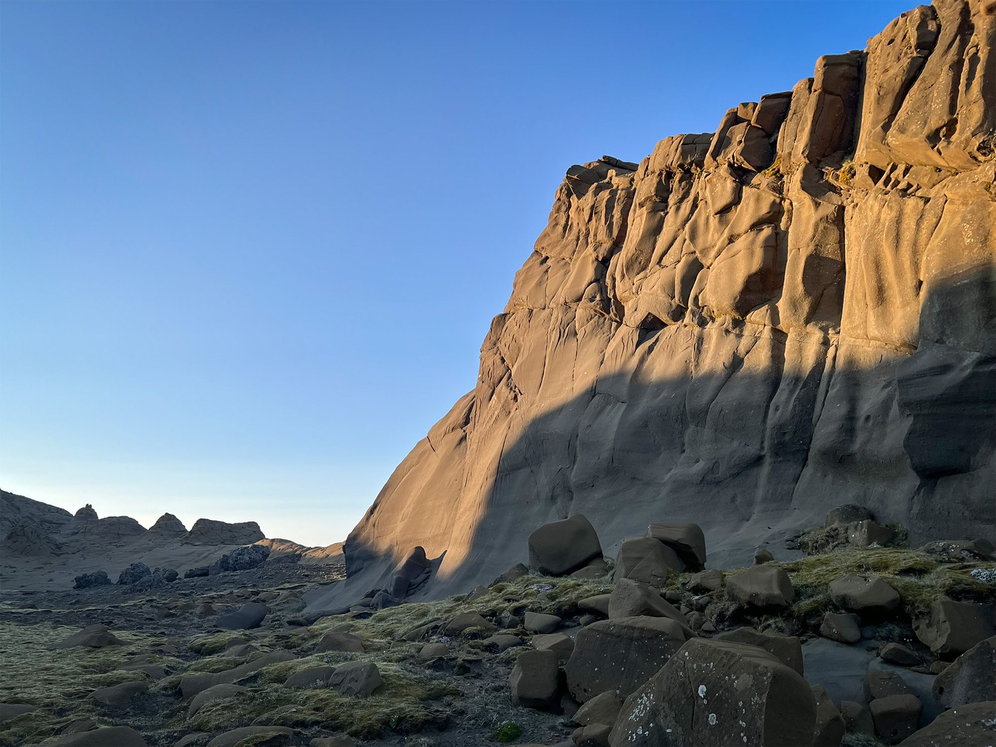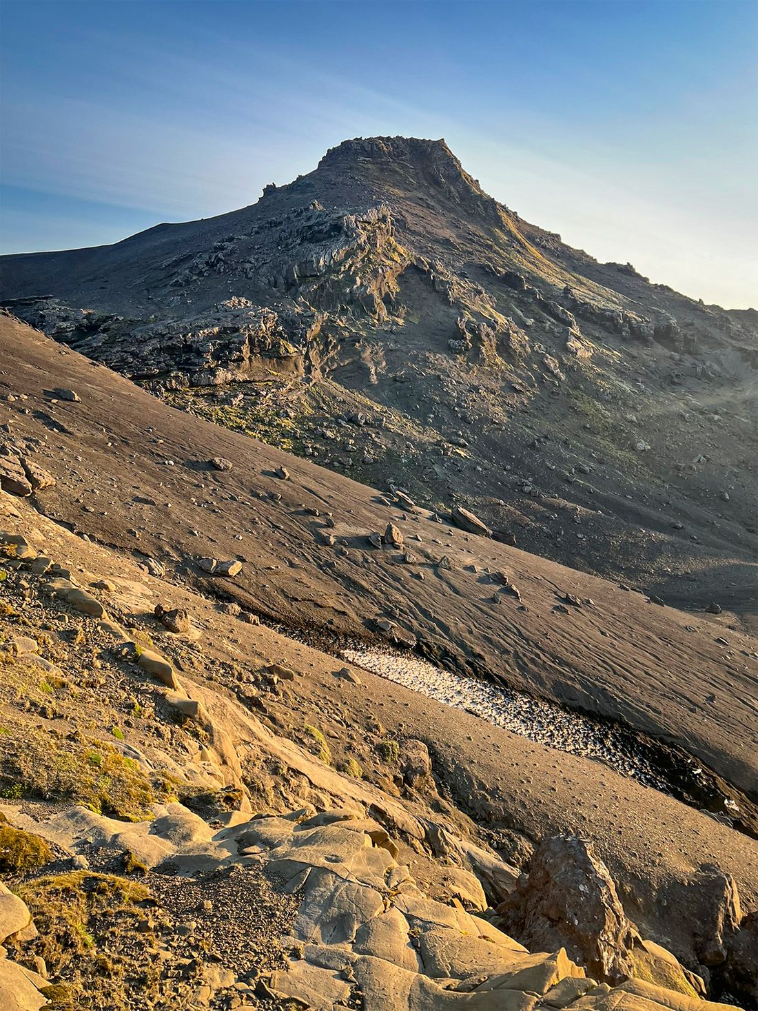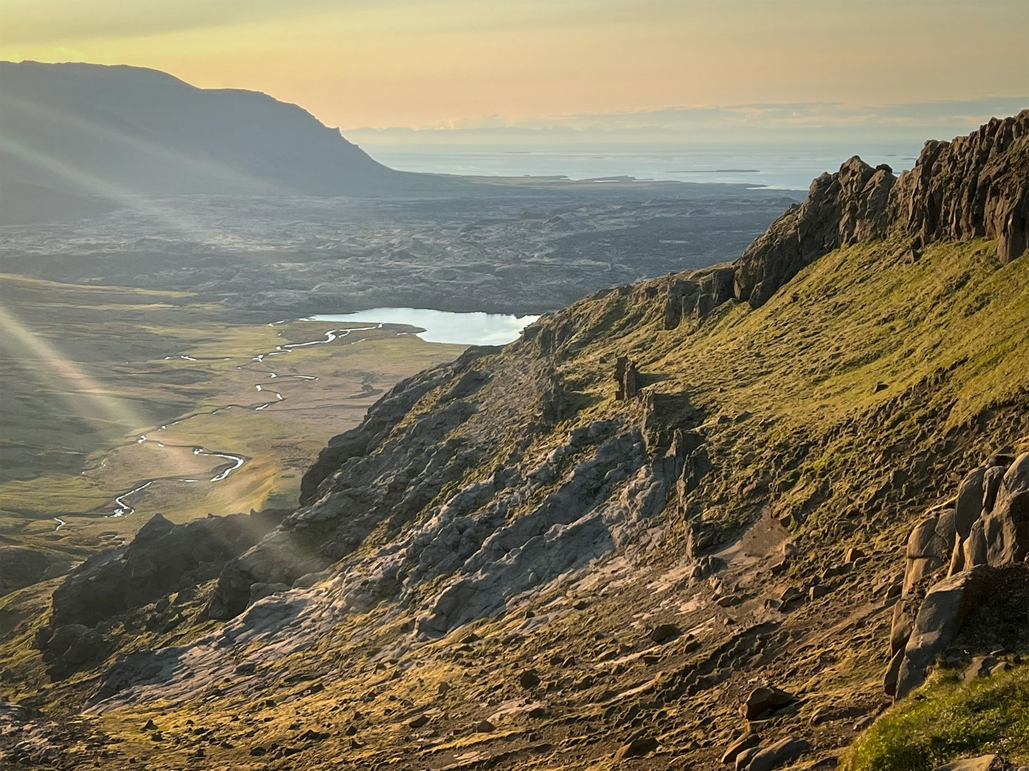 Pogoda była jak marzenie, okolica bezludna. Na przystawkę weszłam na przycupniętą między jeziorami, niepozorną Vatnafell. Jest mniejsza od Horna tylko o 60 metrów, ale jakże odmienna. Taki duży ziemniak. Piszę to z sympatią, bo nasze krótkie spotkanie było przyjemne. Płaska powierzchnia góry, prócz sterty kamieni, oferuje komfortowe materace z mchu.