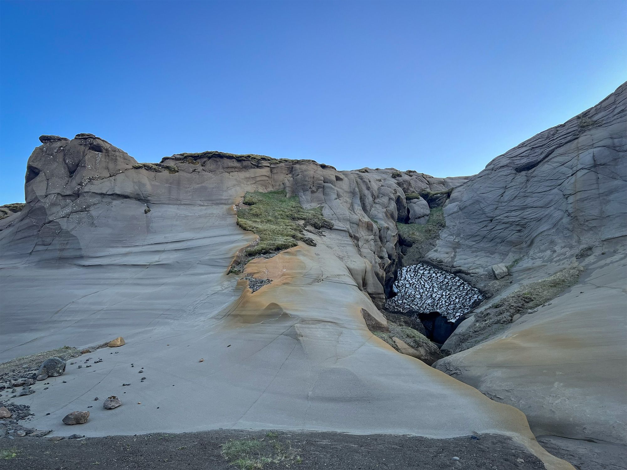 Myślę, że tutaj i powyżej przez kilka miesięcy w roku leży śnieg, który topniejąc wypłukuje skały i spływa do jeziora. Nie znajduję innego wytłumaczenia tych przedziwnych form. Niektóre z nich to ewidentnie koryta strumieni, wyrzeźbione w miękkie łuki.