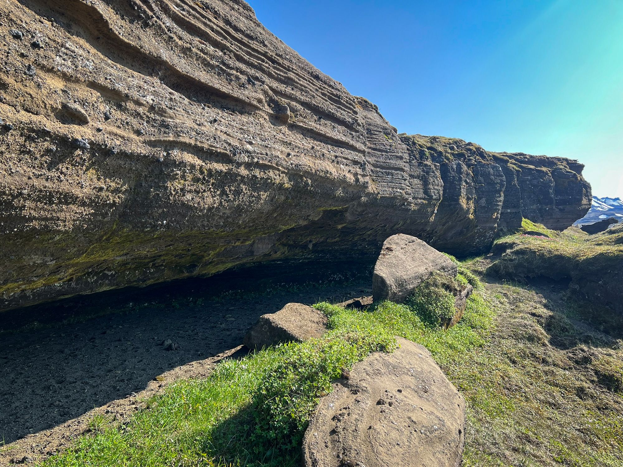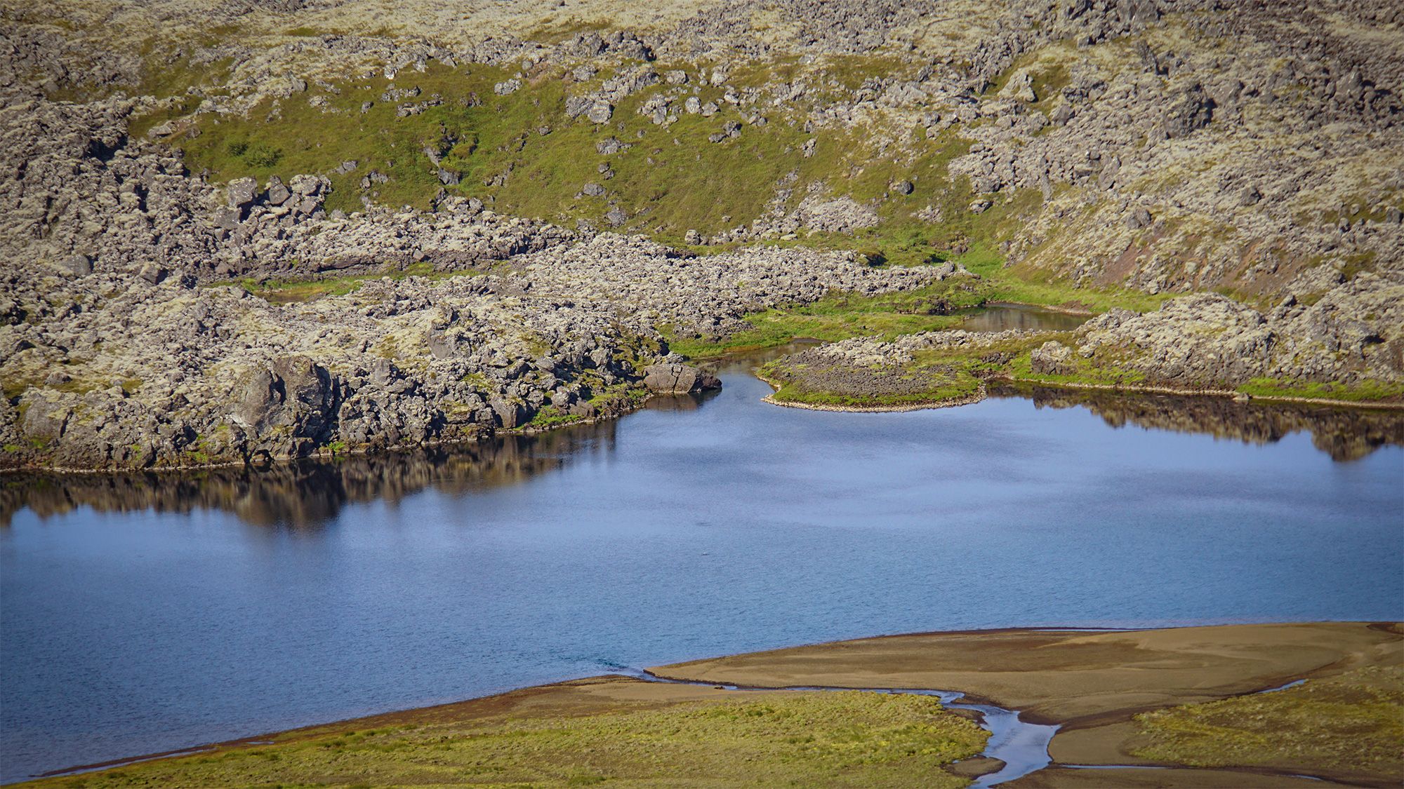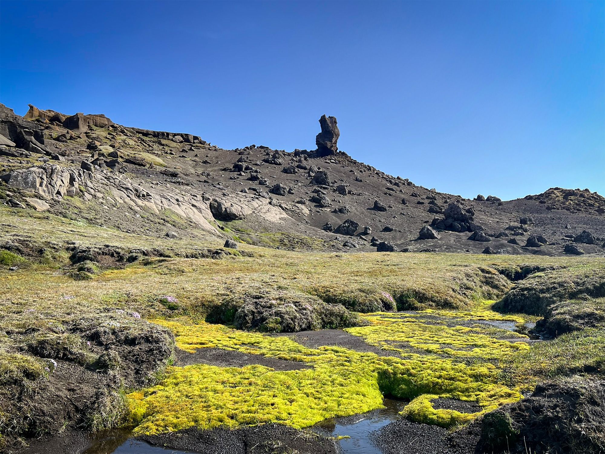 Dojechałam do linii wzgórz, gdzie musiałam porzucić hondzię. Podczas erupcji lawa zatrzymała się w tym miejscu, tworząc solidny, wielometrowy mur. U jego stóp przycupnęły urocze, porośnięte trawą zatoczki. Nic tylko rozłożyć stolik i zająć się prowiantem. Jednak dzyndzel nie mógł dłużej czekać, ruszyłam więc w górę, po mchu i borówkach. Wyżej czekały połacie wysokiej i sztywnej trawy, po której marsz był bardzo niewygodny, jak po głębokim śniegu.