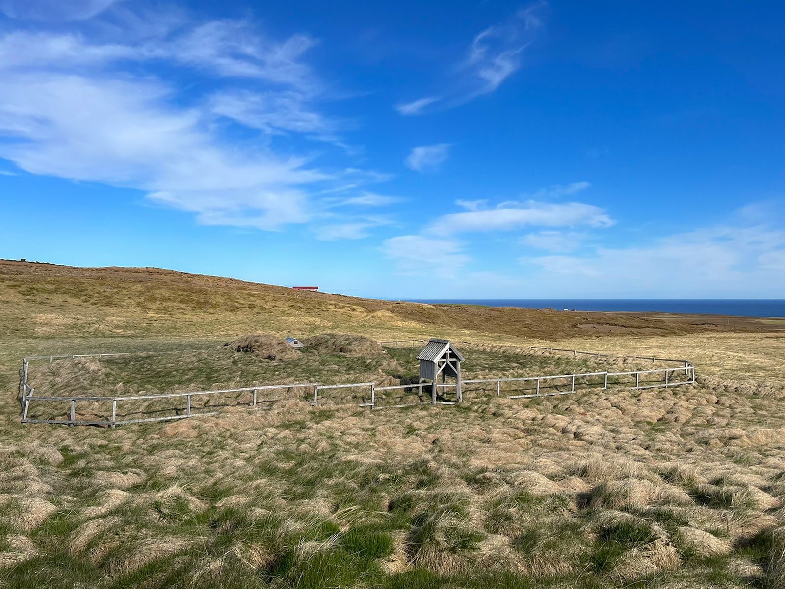 Zachęcona historią wyczytaną z tablicy idę w pola. Pogoda jest idealna, a otwarty teren oferuje panoramę z górami, lodowcem Snæfellsjökull i oceanem. Skaczę przez chwilę po wszechobecnych kępach. Są miękkie i puszyste, lecz pomiędzy nimi czyhają głębokie szczeliny, więc szybko wracam na ścieżkę. Taka kępa (þúfa) to bardzo charakterystyczny element islandzkiego krajobrazu.
