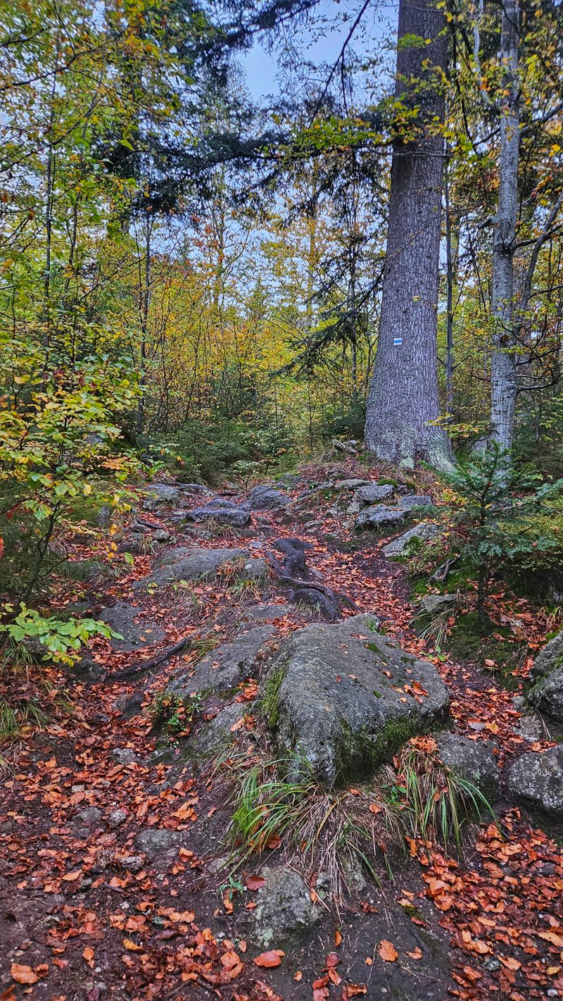 Po 500 metrech jsem ze silnice odbočil na lesní cestu. Po dalších 300 metrech jsem se napojili na modrou turistickou trasu, která vedla až k hradu Kunžvart.