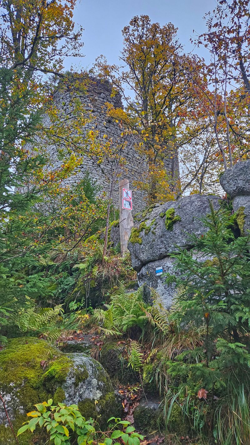 Po 2 km a 200 metrovém převýšení jsem mezi stromy spatřil zříceninu hradu.