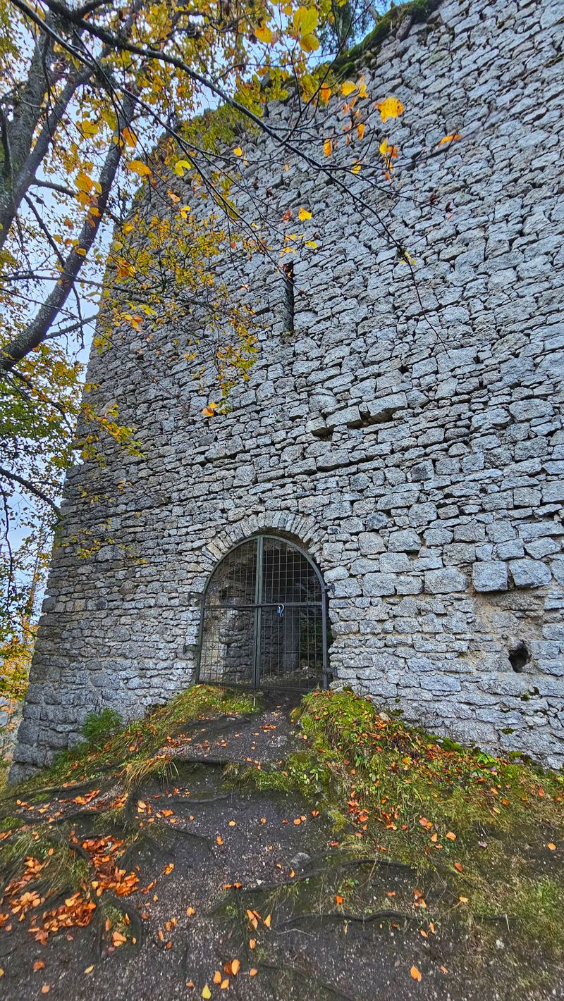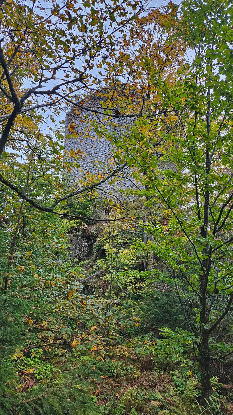 - After 2 km and 200 meters of elevation gain, I saw the ruins of the castle among the trees.