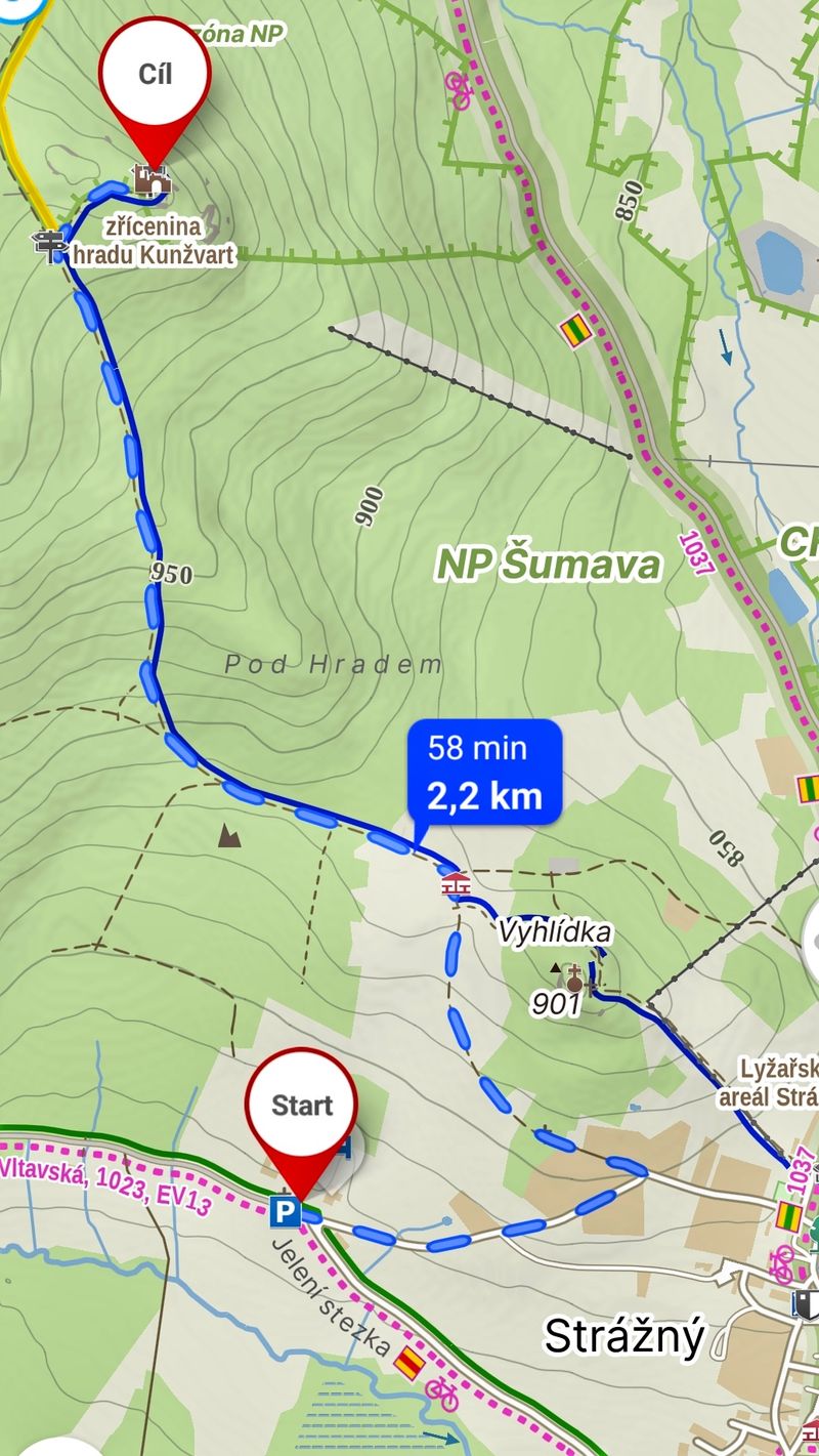 - After 500 metres I turned off the road onto a forest track. After another 300 meters I joined the blue hiking trail that led to Kunžvart Castle.