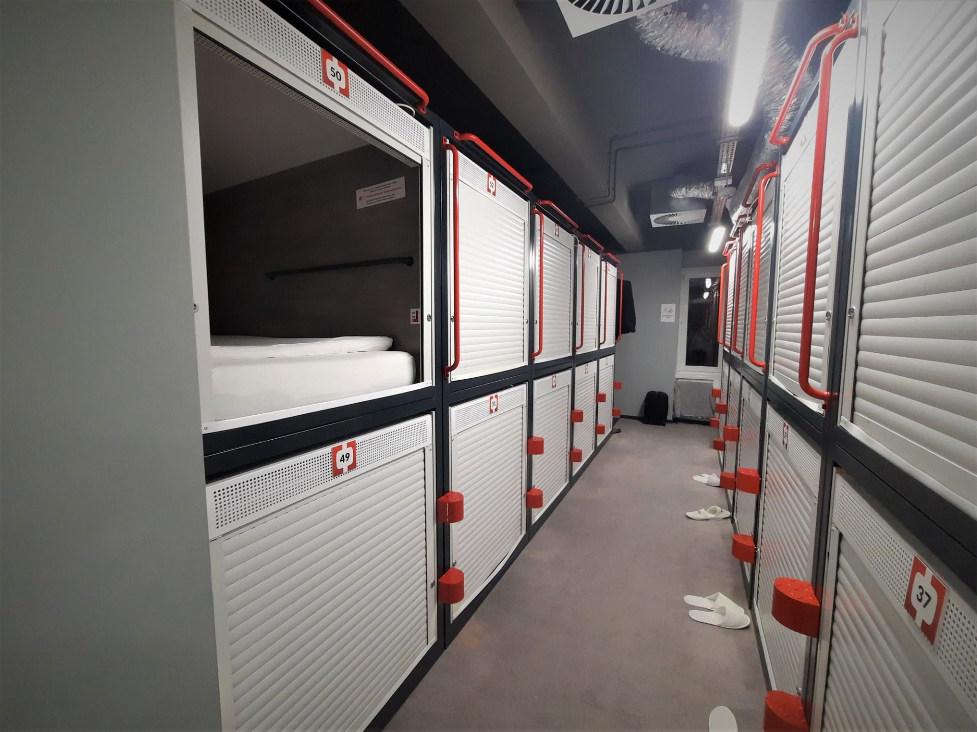 Wchodząc do sali noclegowej zastaniemy rzędy kapsuł oraz szafki do przechowywania bagaży. W przypadku większych walizek można je po prostu położyć gdzieś na podłodze. Na sali obowiązuje całodobowa strefa ciszy.