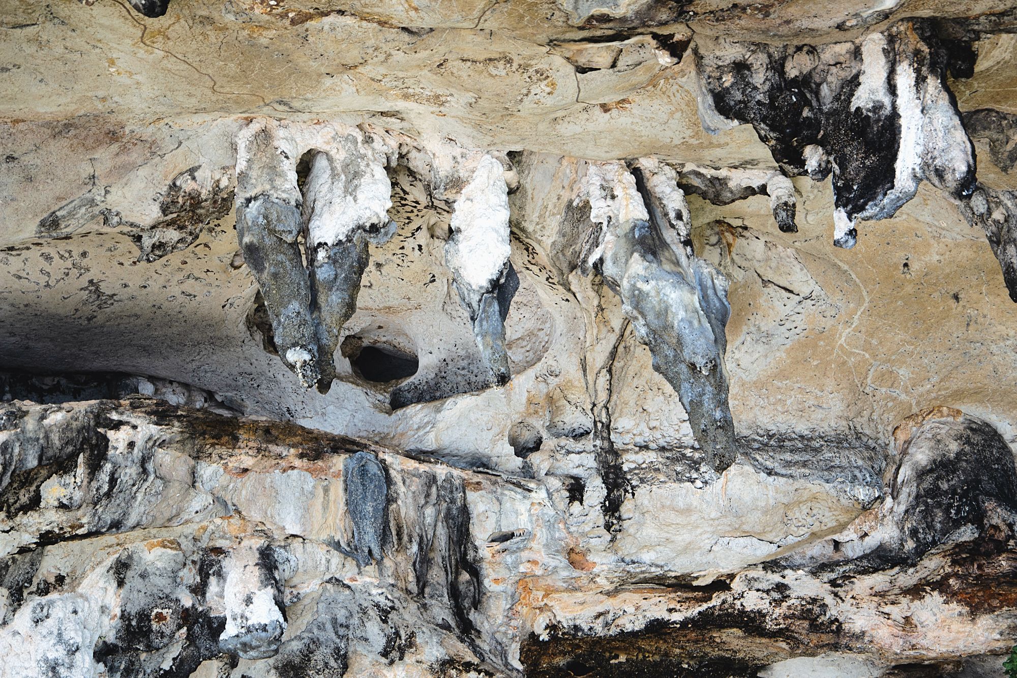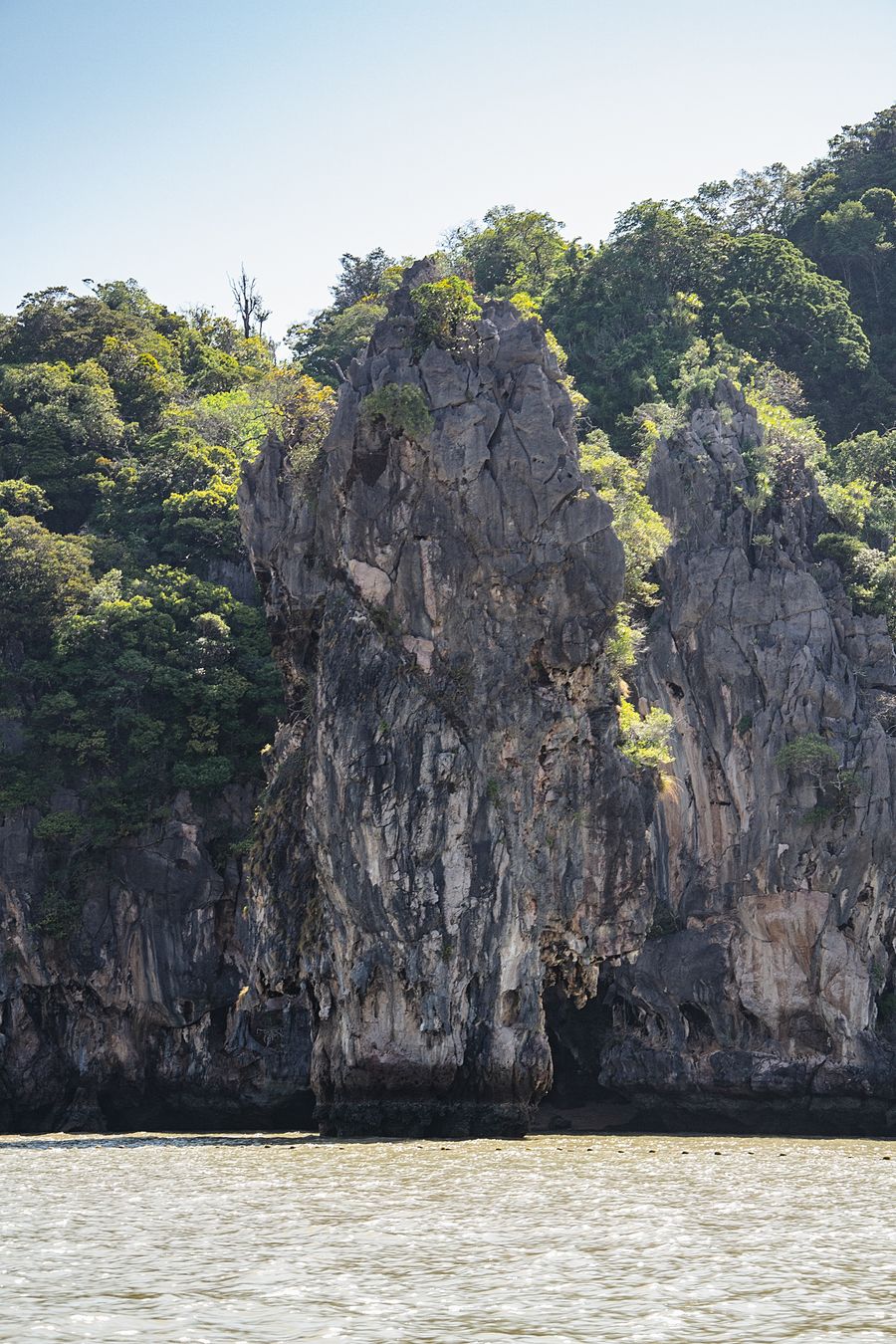 As we cruised deeper into Phang Nga Bay, the scenery got even more impressive. Towering rocks surrounded us, some covered in green trees, others with dark caves carved into their sides. One cliff had giant stone formations hanging down like frozen waterfalls. When we got closer, we saw the strange textures and colors in the stone. Black, white, orange, even shiny silver patches where minerals had collected over time. It felt like we had sailed into the pages of a fantasy novel.