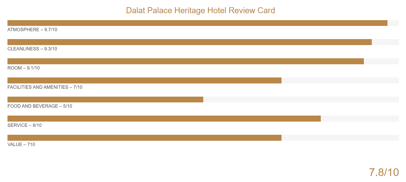 Exceptional heritage place with a lot of untapped potentials. As we always say, it is not just about location, heritage, and design. People are making hospitality, and Dalat Palace Hotel clearly lacks some good management. Running a hotel is a huge deal and you need a lot of good human resources. With a good management team, a place like Dalat Palace Heritage Hotel would easily be one of the best hotels in South East Asia. Start with the website, offer and find your red line. Guests will come to enjoy a unique experience that should be kept in lasting memory.