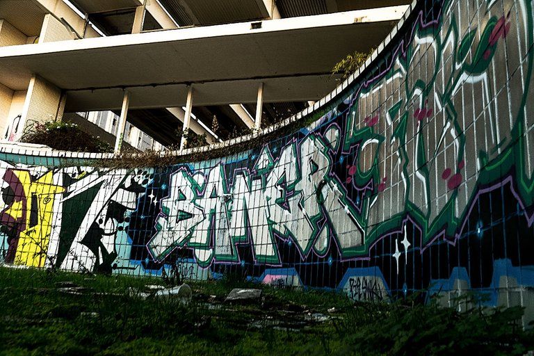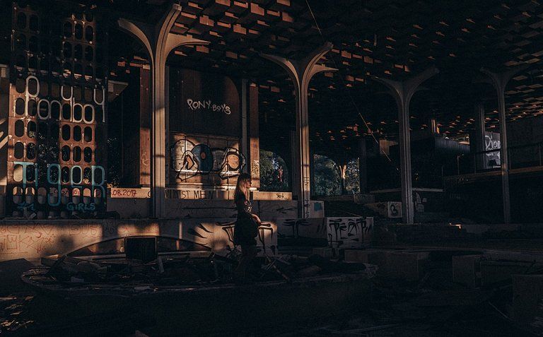 Have you ever been to Island Krk, Croatia? The island itself is nice and green with some beautiful beaches and small old towns. Near town Malinska, we saw some big structures looking out of the forest. When we were approaching the main building, it looked scary. Wild greenery had already started to take over the path that was leading to the hotel. However, there is something beautiful when nature takes over the buildings that are forgotten by mankind. To me, all that broken glass and the devastated interior looked haunted. When we were walking along the hollow corridors that lead to the hotel rooms I felt unease. My heartbeat speeded up when I heard a noise from the other part of the building, even though I knew that it was probably the bird, wind, or maybe another curious soul like us. The main hall was completely opposite to those dark hallways. There, nature performed its magic. The open design let in sunshine and when the wind blew it brought life into the building along. This lobby is my favorite part of the ruins.
