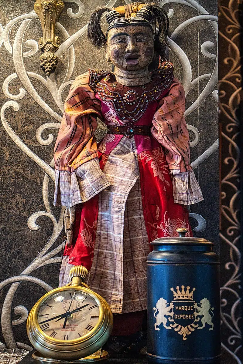 A cross between a gallery and a restaurant shines in dim lights. Its dark interior puts many items into focus, though very casually. In fact, this dining room is quite an event on its own. A space filled with many different antiques that arrived at Ho Chi Minh from all around the world.