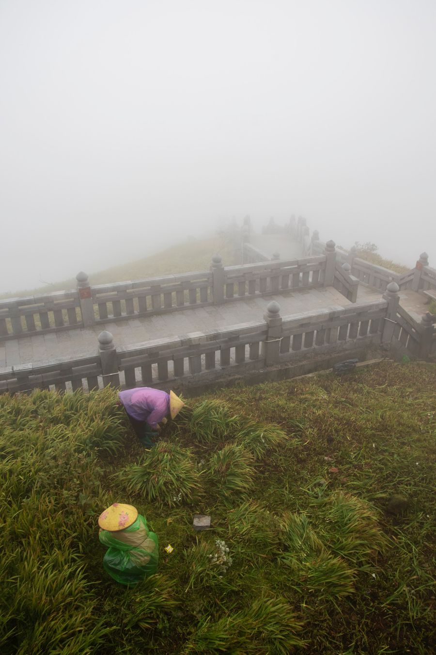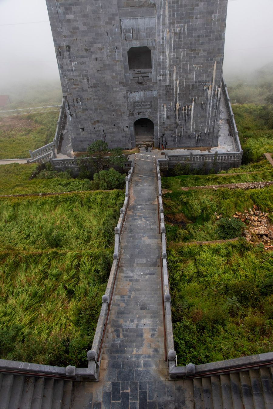 Jeśli przyjrzycie się powyższemu zdjęciu, to zobaczycie na szczycie kilka budowli. Ta z prawej (taki mały kwadracik) to budynek kolejki. Wcale nie taki mały. Potem, żeby dostać się na sam szczyt trzeba pokonać ok 600 schodów lub... wjechać kolejną kolejką, tym razem zębatą. Po drodze widać jeszcze budynek wieży, wielki posąg Buddy i na samym szczycie jest dość spory maszt. Ponoć jeśli staniecie przy kościele w Sapie i będziecie widzieć te budynki, to znaczy, że pogoda na górze będzie dobra. My niestety nie mieliśmy tyle szczęścia...