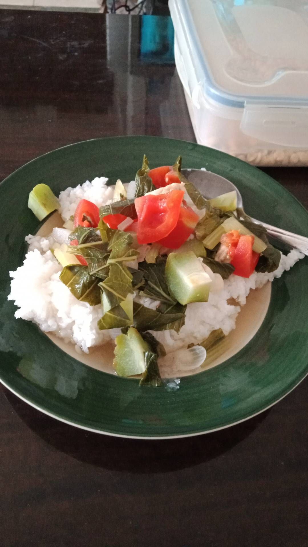 Makan siang hari dengan masakan sayuran yang dimasak sendiri.