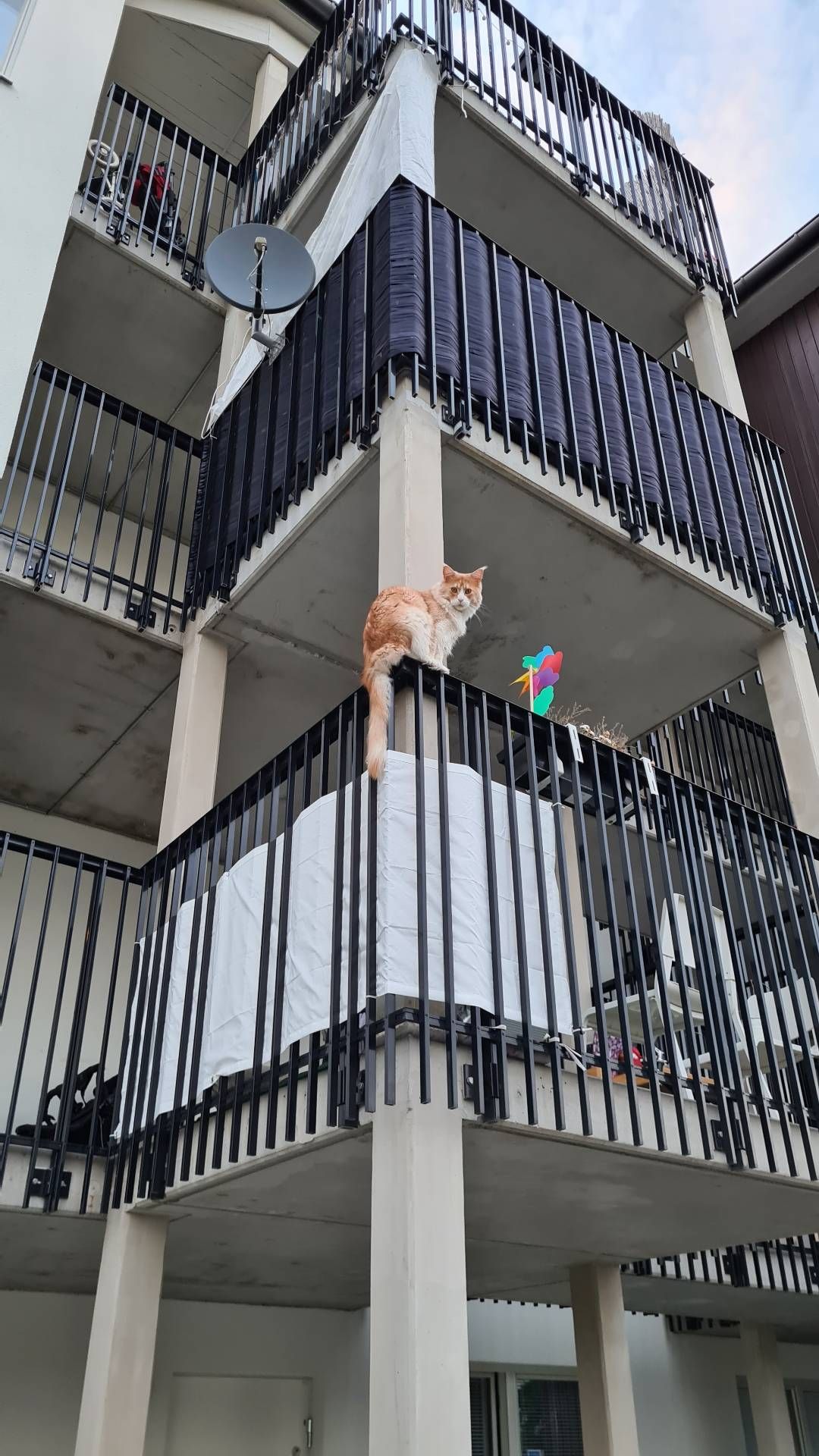 Amazingly, the cat stays on the edge of the balcony where s/he lives. I met the cat when I was taking a walk near my apparent. I was a bit worried, but it seems that is how cats are! ๐