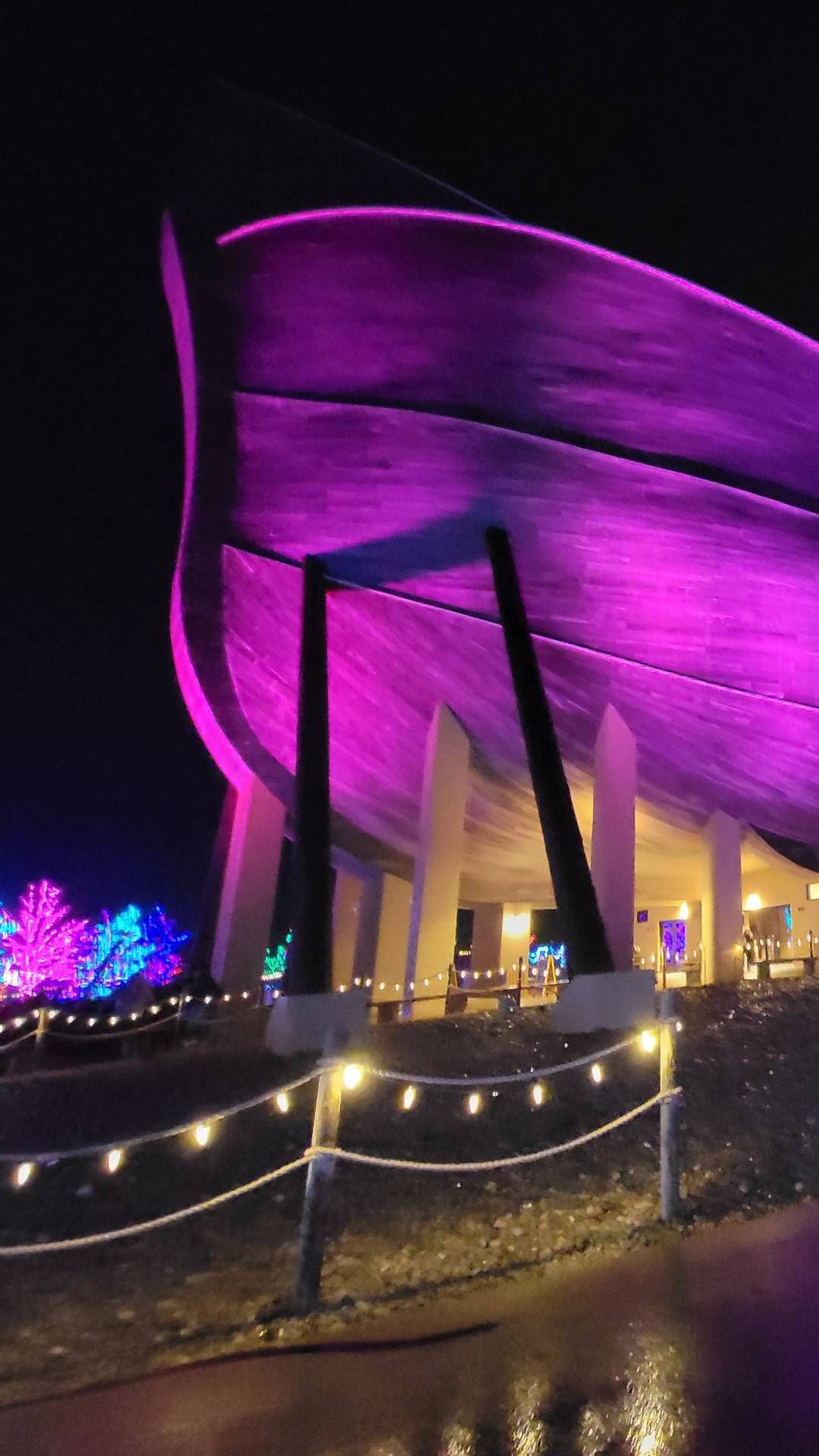 This is the "Ark Encounter." In Ohio, this is a full sized replica of Noah's Ark at night under lighting...
